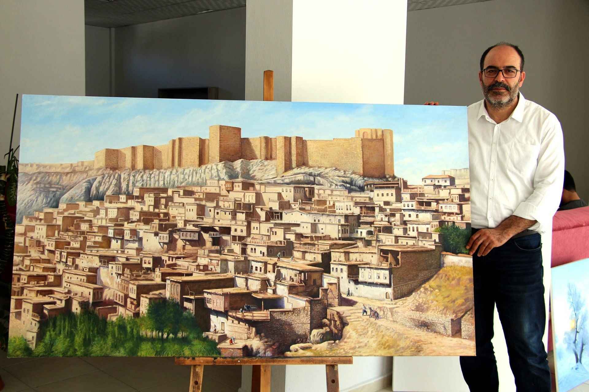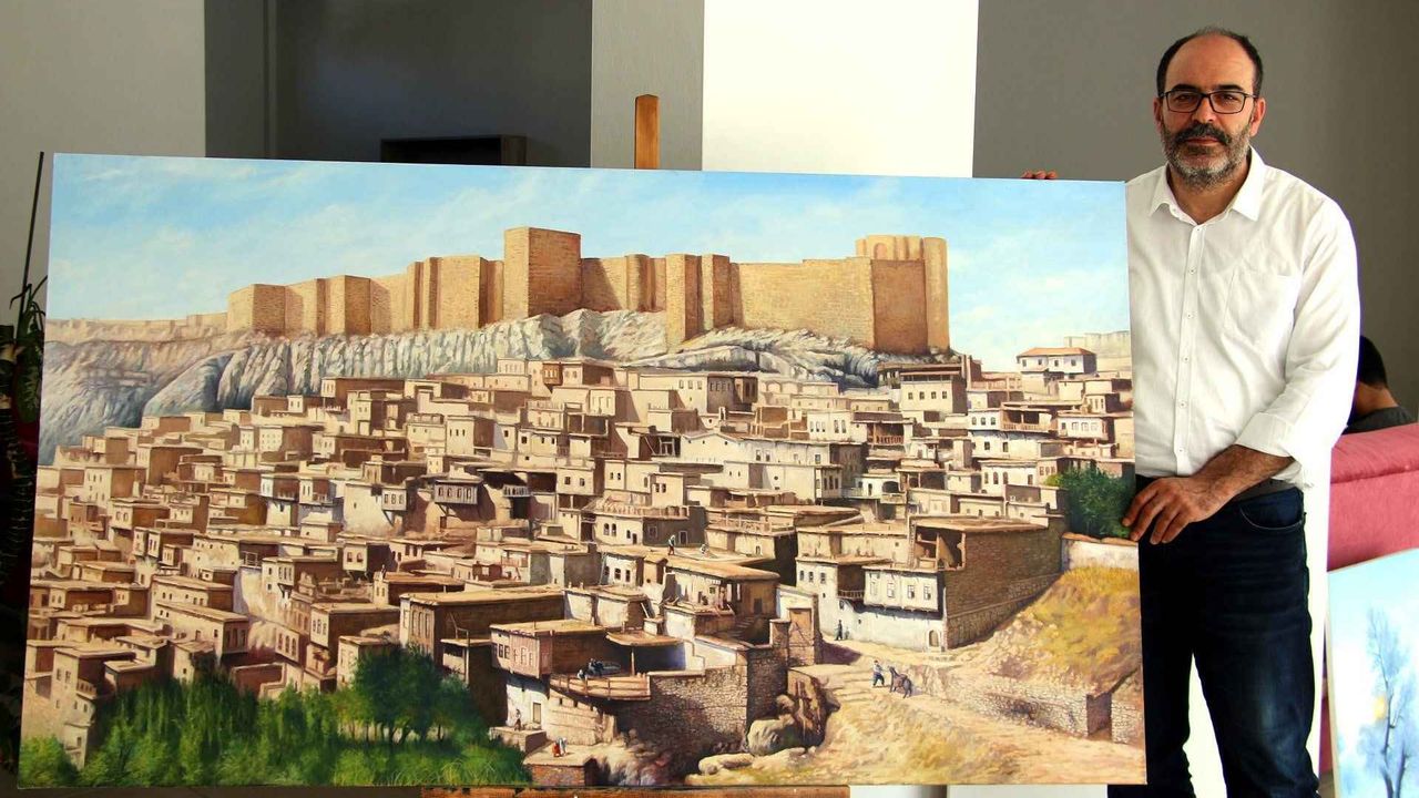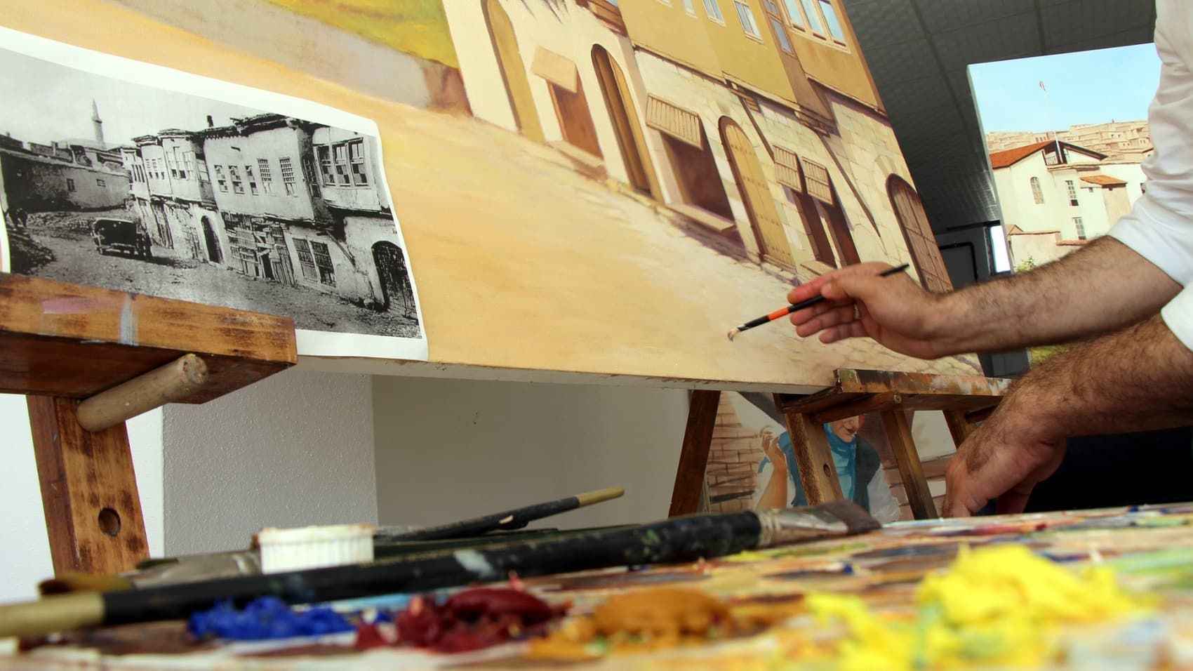Elazığ Valiliği himayesinde, tarihi Harput Mahallesi'nde yürütülen "Harput Kale içi arkeolojik kazılarının gün yüzüne çıkarılması projesi" kapsamında, eski yıllarda çekilen siyah beyaz fotoğraflar, resim öğretmeni İsmet Ercan tarafından tuvale yansıtılıyor.