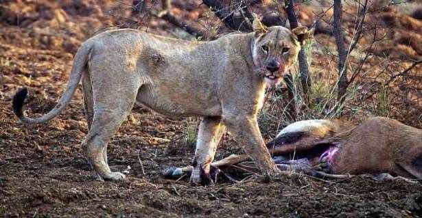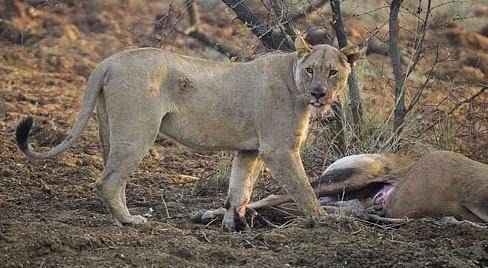 Aç dişi bir aslan zorlu bir kovalamanın ardından ceylanı yakalamayı başarıyor.