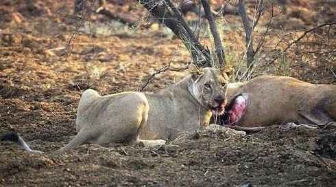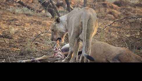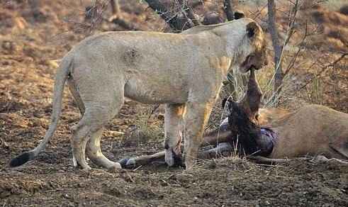 Ceylanın karnından yavaşça yavruyu çıkaran aslan, ceylan yavrusunun üzerinde bulunan atıkları dakikalarca yalayarak temizledi.