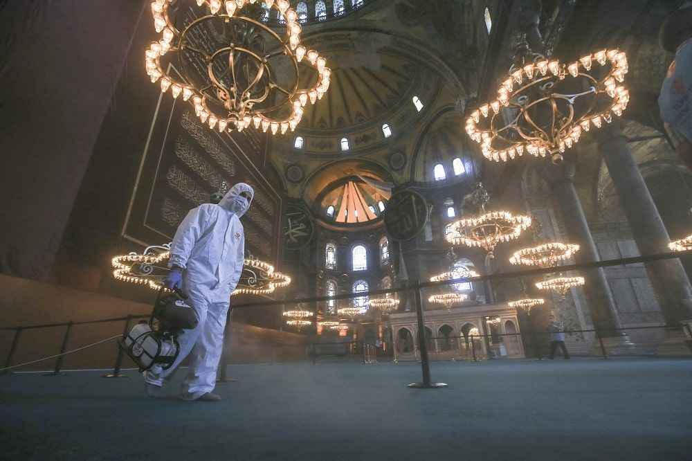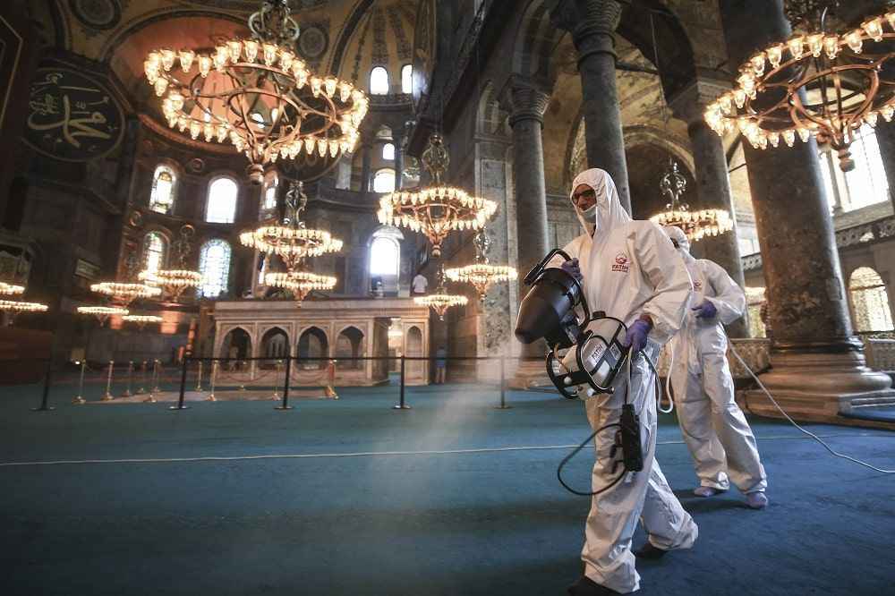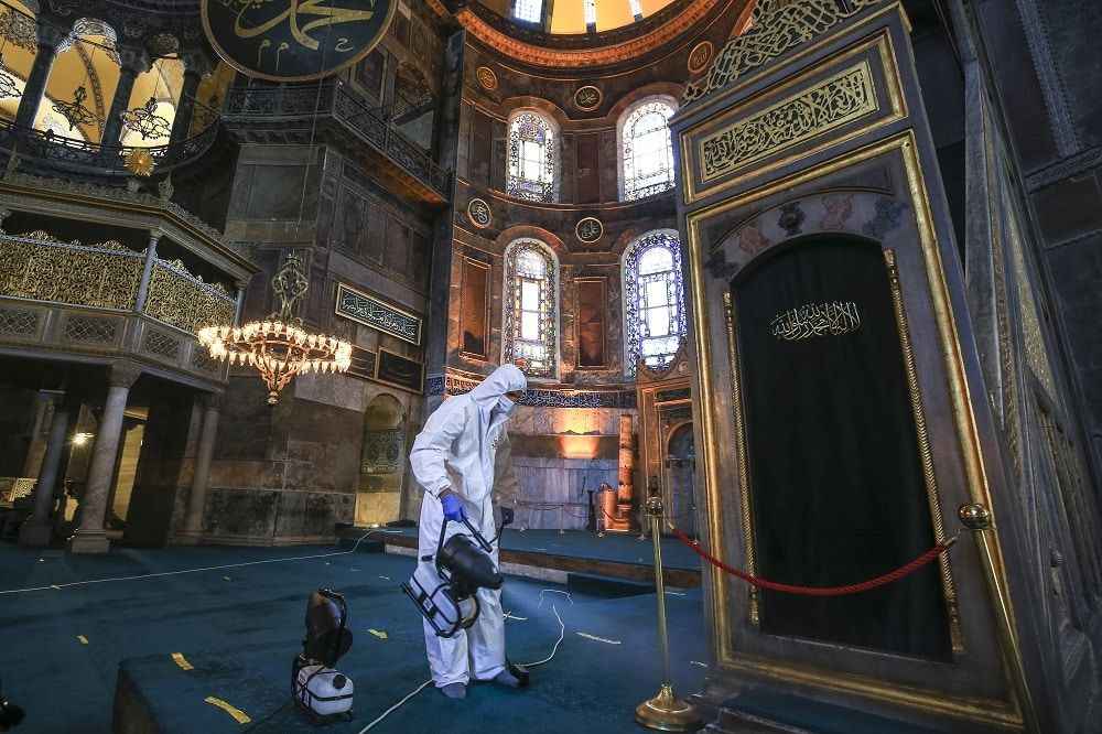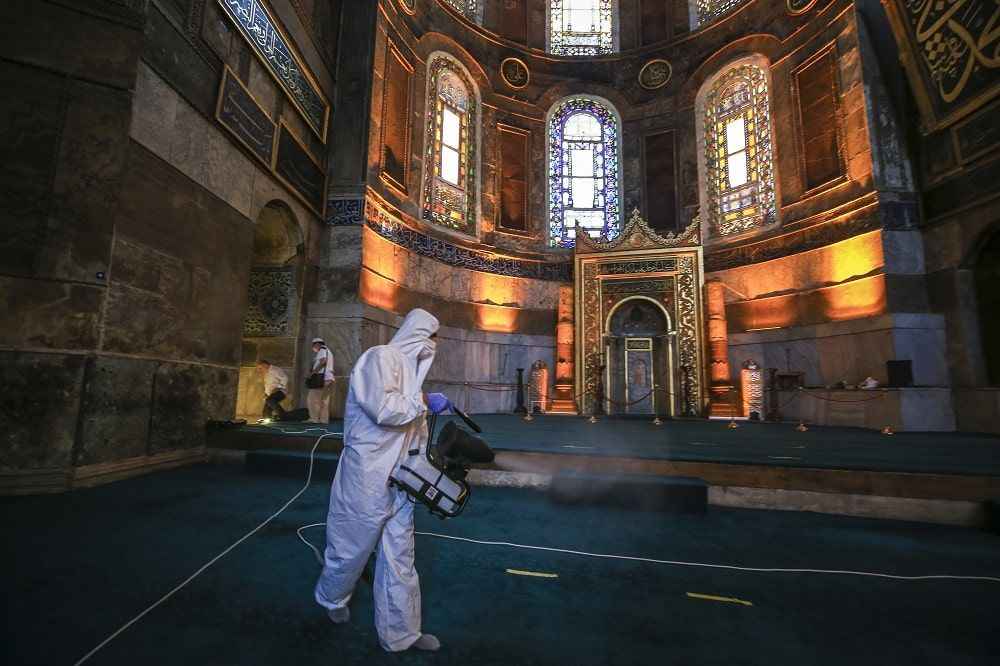 Dezenfekte çalışmasının ardından Isparta'dan getirilen gül suyu, Ayasofya-i Kebir Camii'nin duvarlarına ve halılarına püskürtme yöntemiyle sıkıldı.