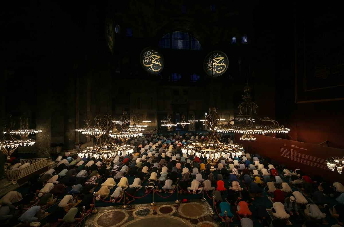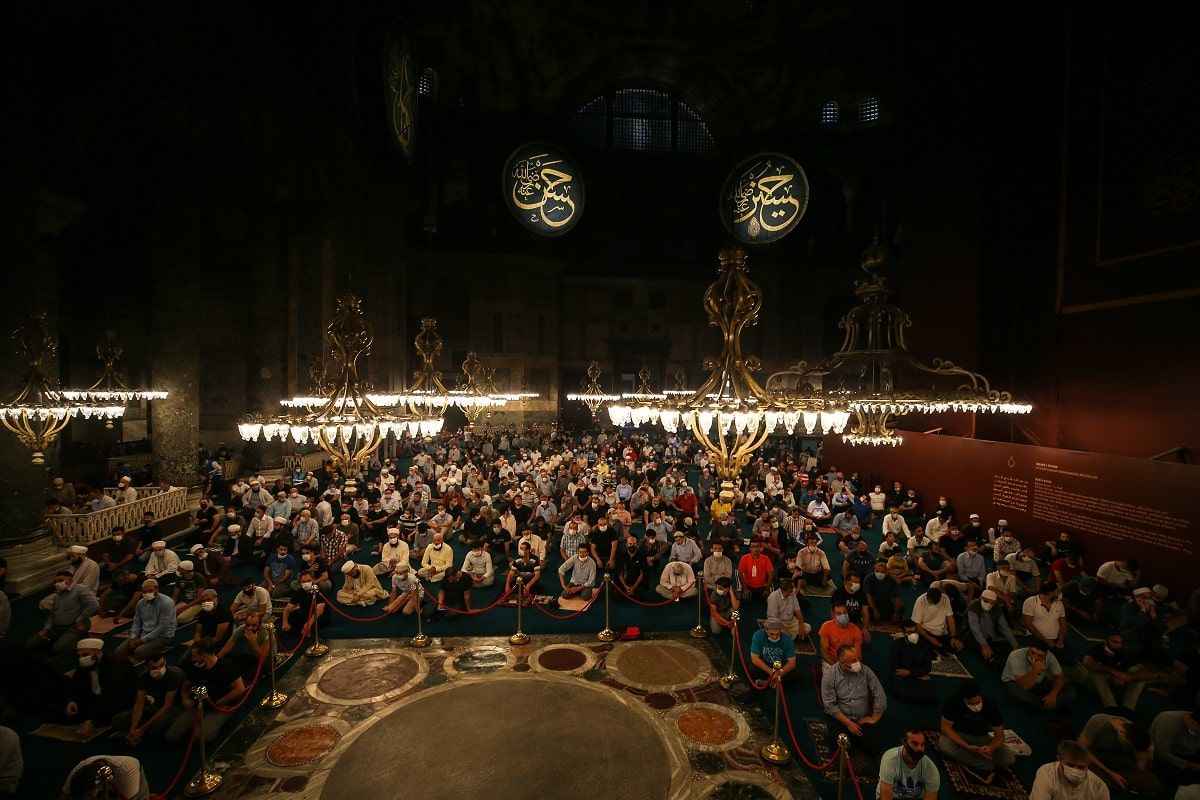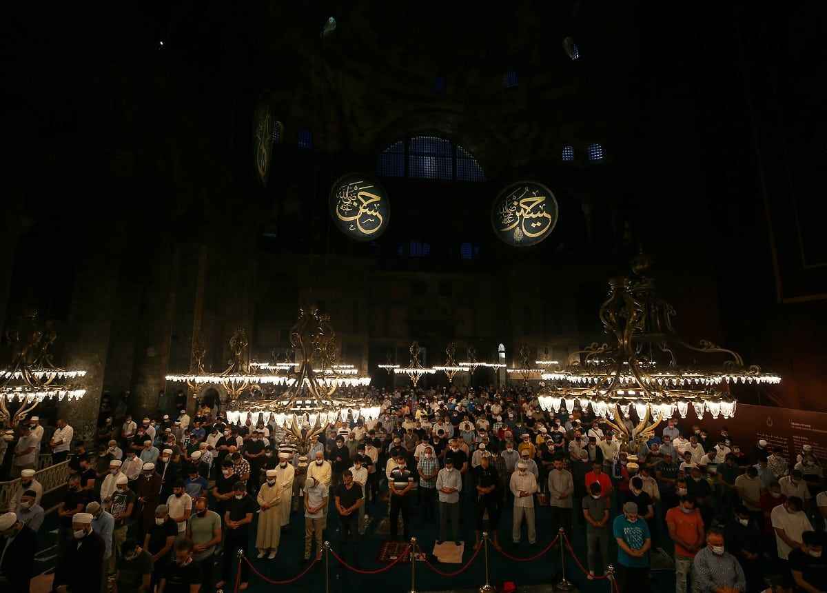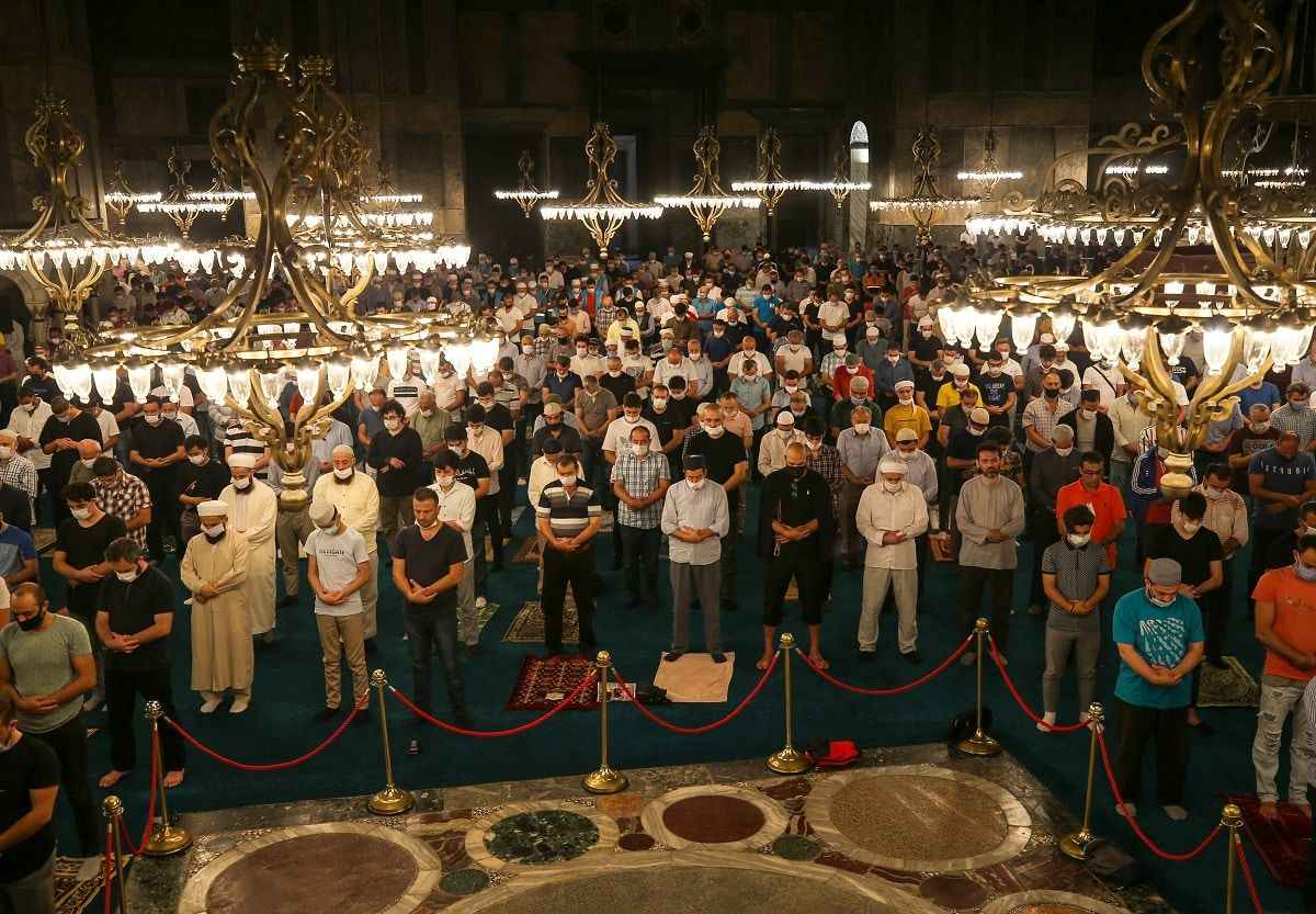 Ezanın okunmasının ardından vatandaşlar namazı kılmak için saf tutarken bazılarının ise Ayasofya Meydanı'nda yere serilen hasırlar üzerinde namazını kıldığı gözlemlendi.