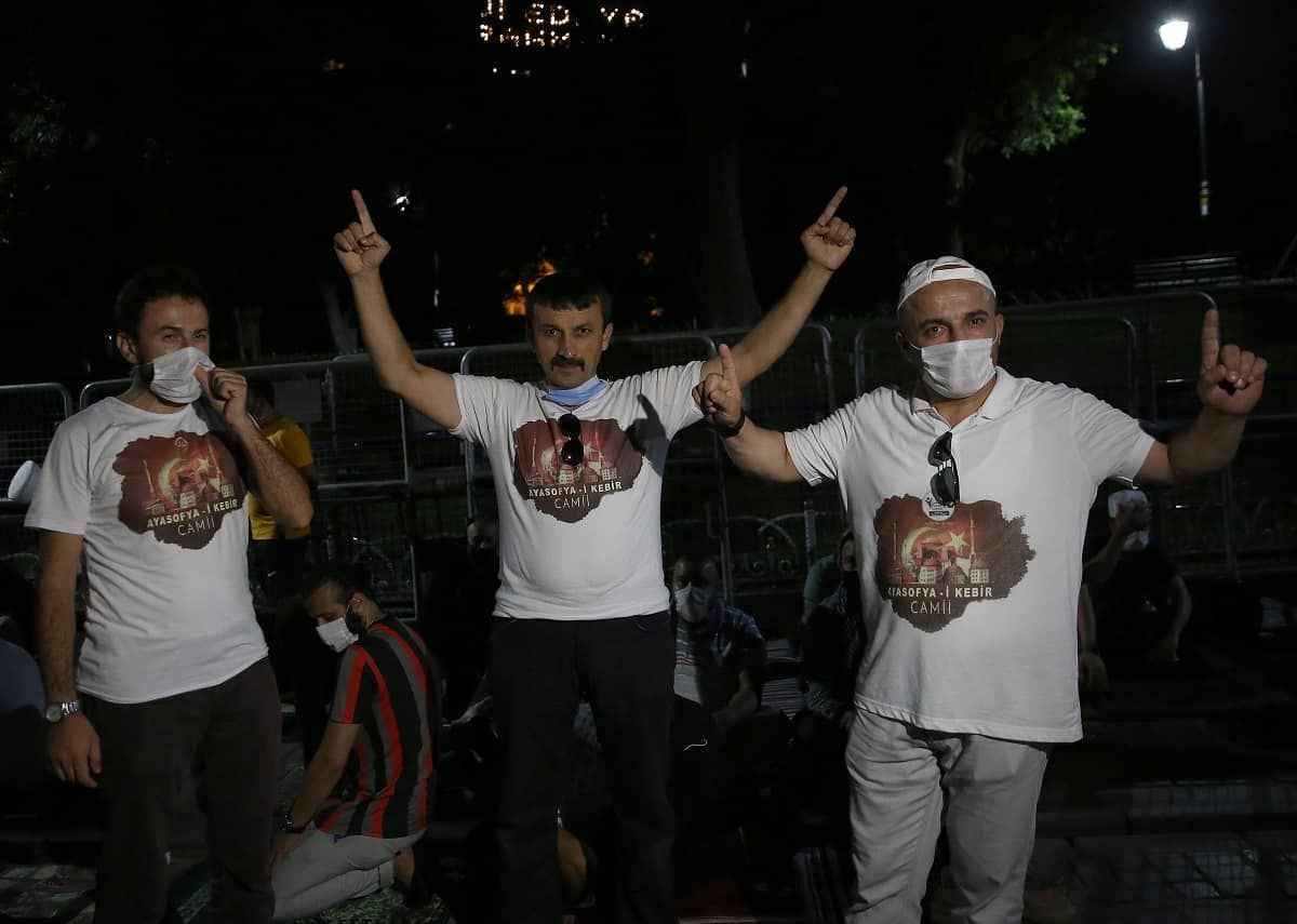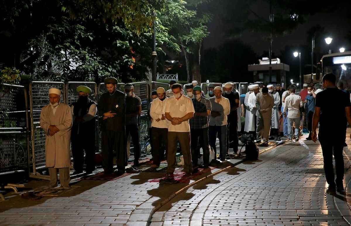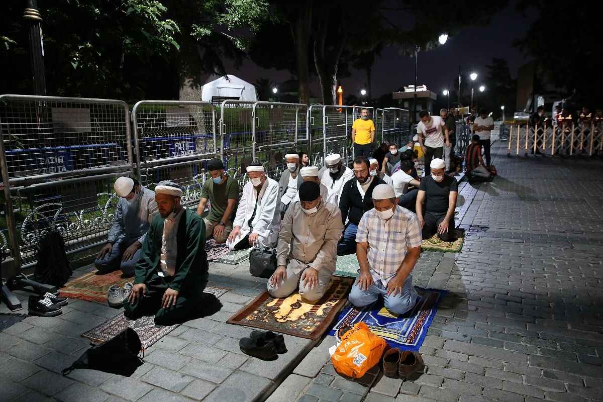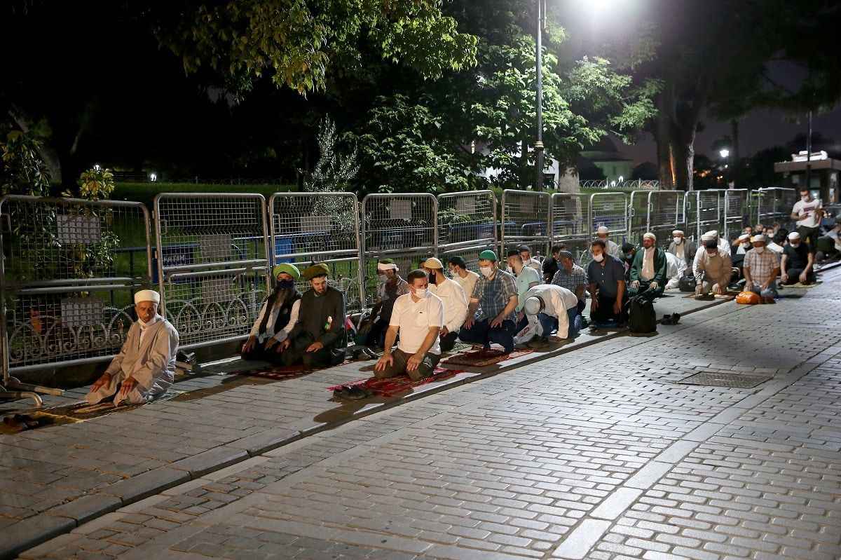 Ayasofya-i Kebir Cami-i Şerifi'ne sabah namazı için gelen vatandaşlar, bölgeye alınmayınca namazı güvenlik noktalarında kıldı.