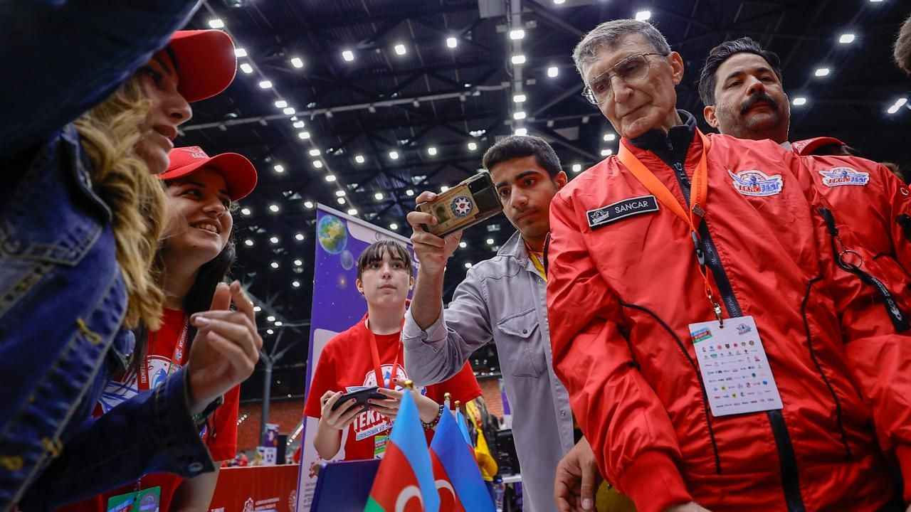 TEKNOFEST Azerbaycan devam ediyor. Festivalde Nobel ödüllü Türk bilim insanı Prof. Dr. Aziz Sancar, festival alanını gezdi, öğrencilerle sohbet etti. \n