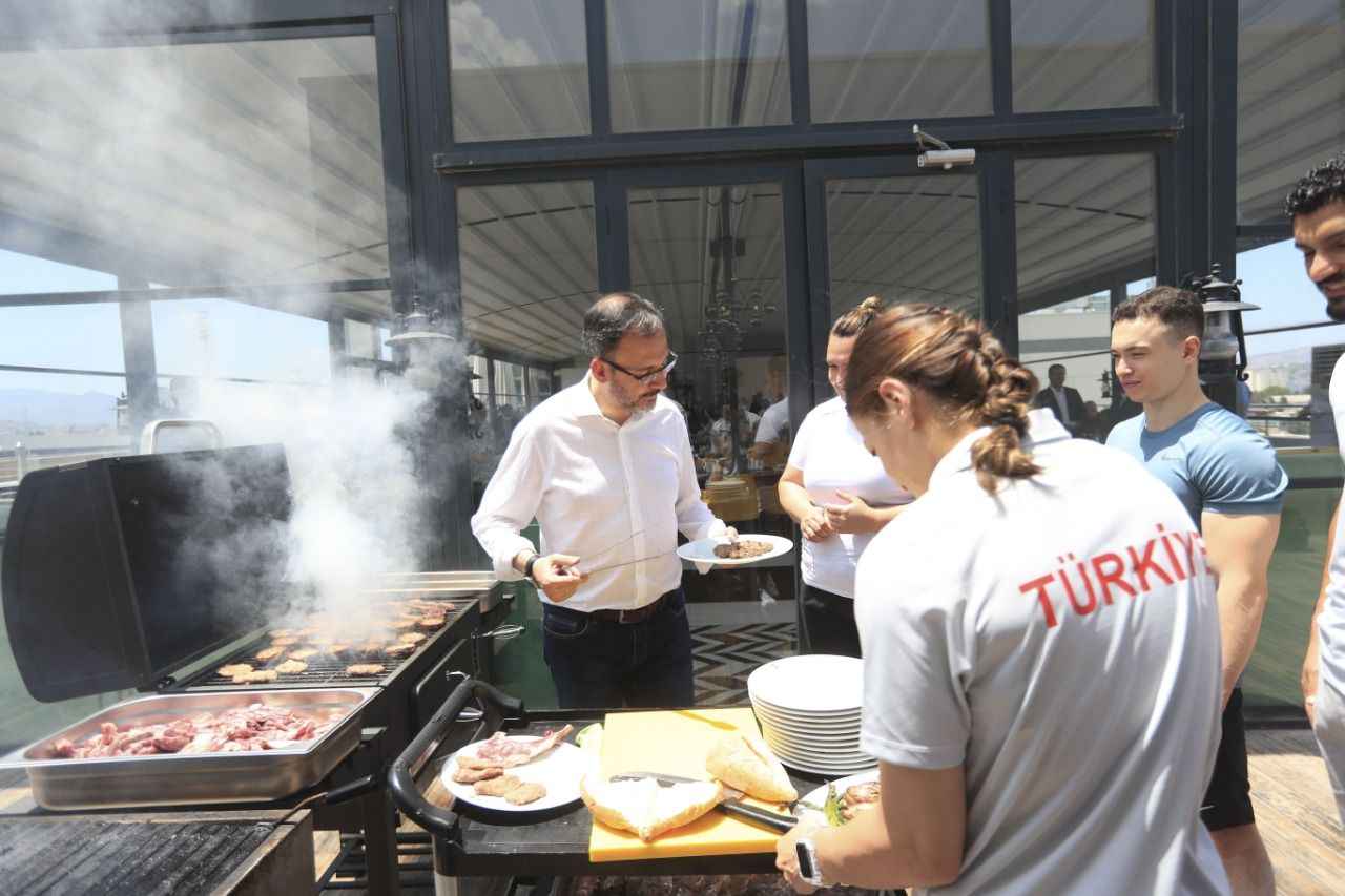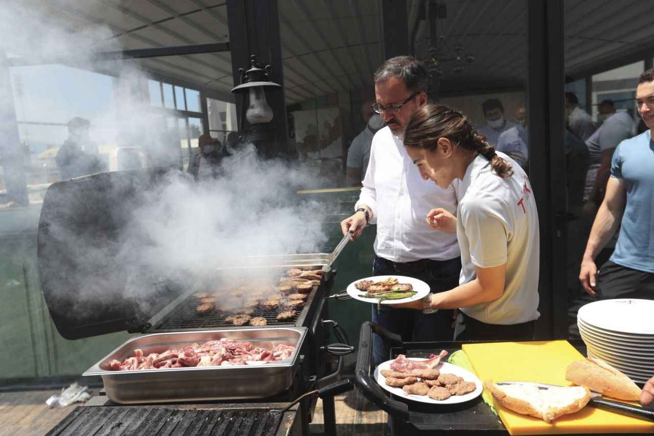 Bakan Kasapoğlu, daha sonra düzenlenen barbekü etkinliğinde ızgaranın başına geçerek köfte pişirip, milli sporculara ikram etti.