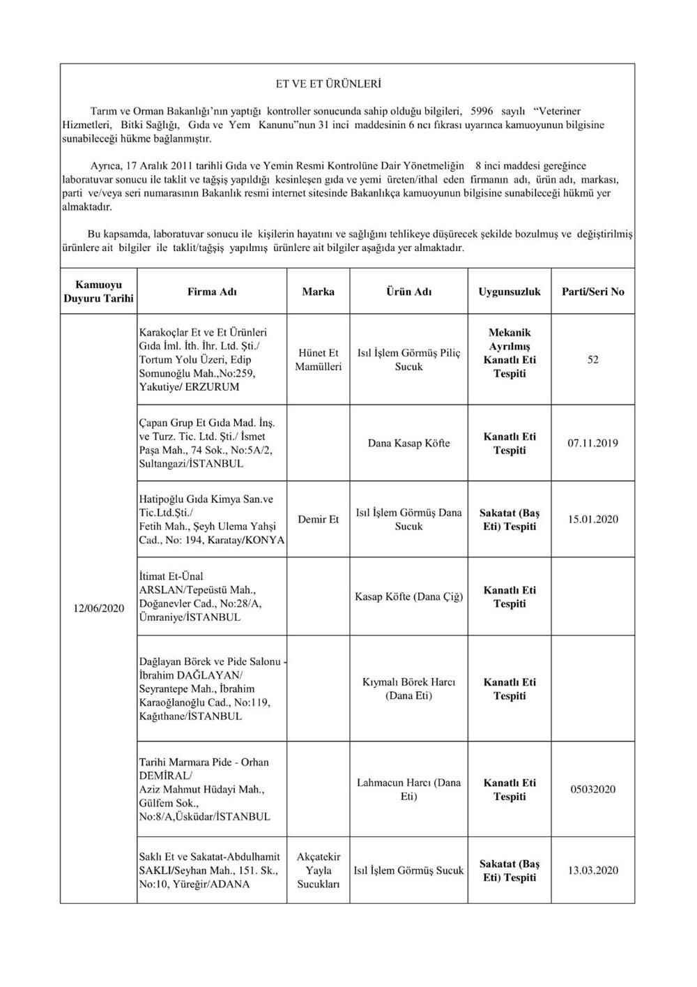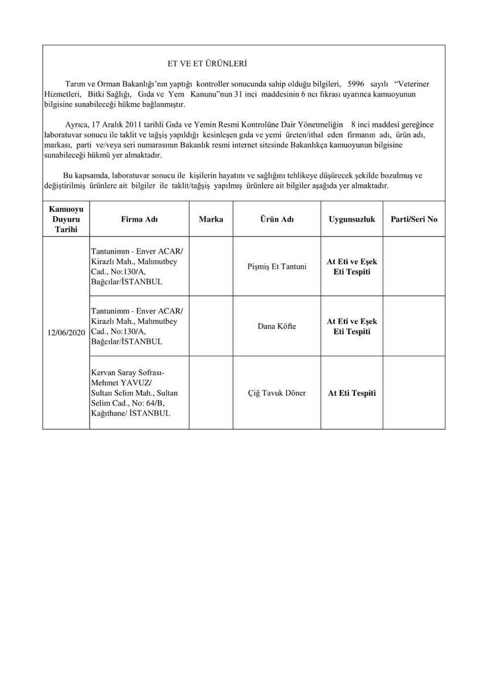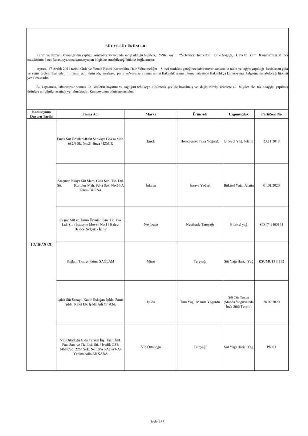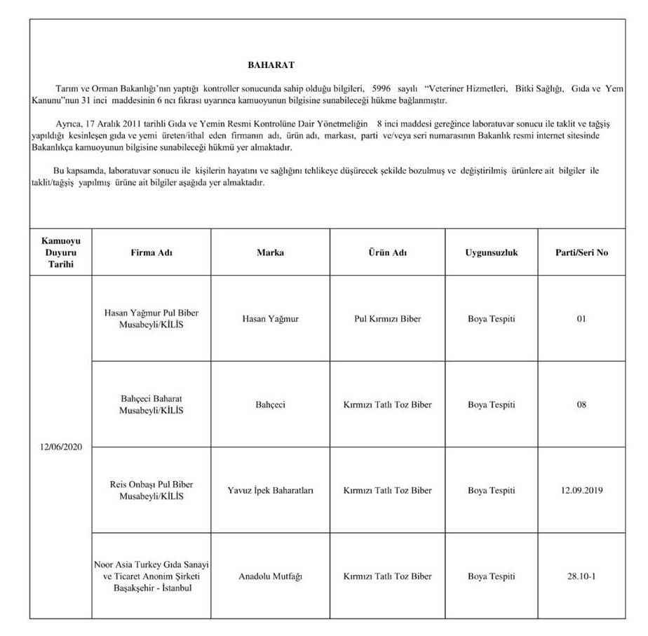 "5996 sayılı “Veteriner Hizmetleri, Bitki Sağlığı, Gıda ve Yem Kanunu” ve bu Kanun kapsamında hazırlanan, “Gıda ve Yemin Resmi Kontrollerine Dair Yönetmelik” gereğince; laboratuvar sonucuyla taklit veya tağşiş yapıldığı kesinleşen gıdaları üreten/ithal eden; kişilerin hayatını ve sağlığını tehlikeye düşürecek şekilde bozulmuş, değiştirilmiş gıdaları üreten ve/veya satan firmanın adı, ürün adı, markası, parti ve/veya seri numarasını içeren bilgiler kamuoyunun bilgisine sunulmaktadır.