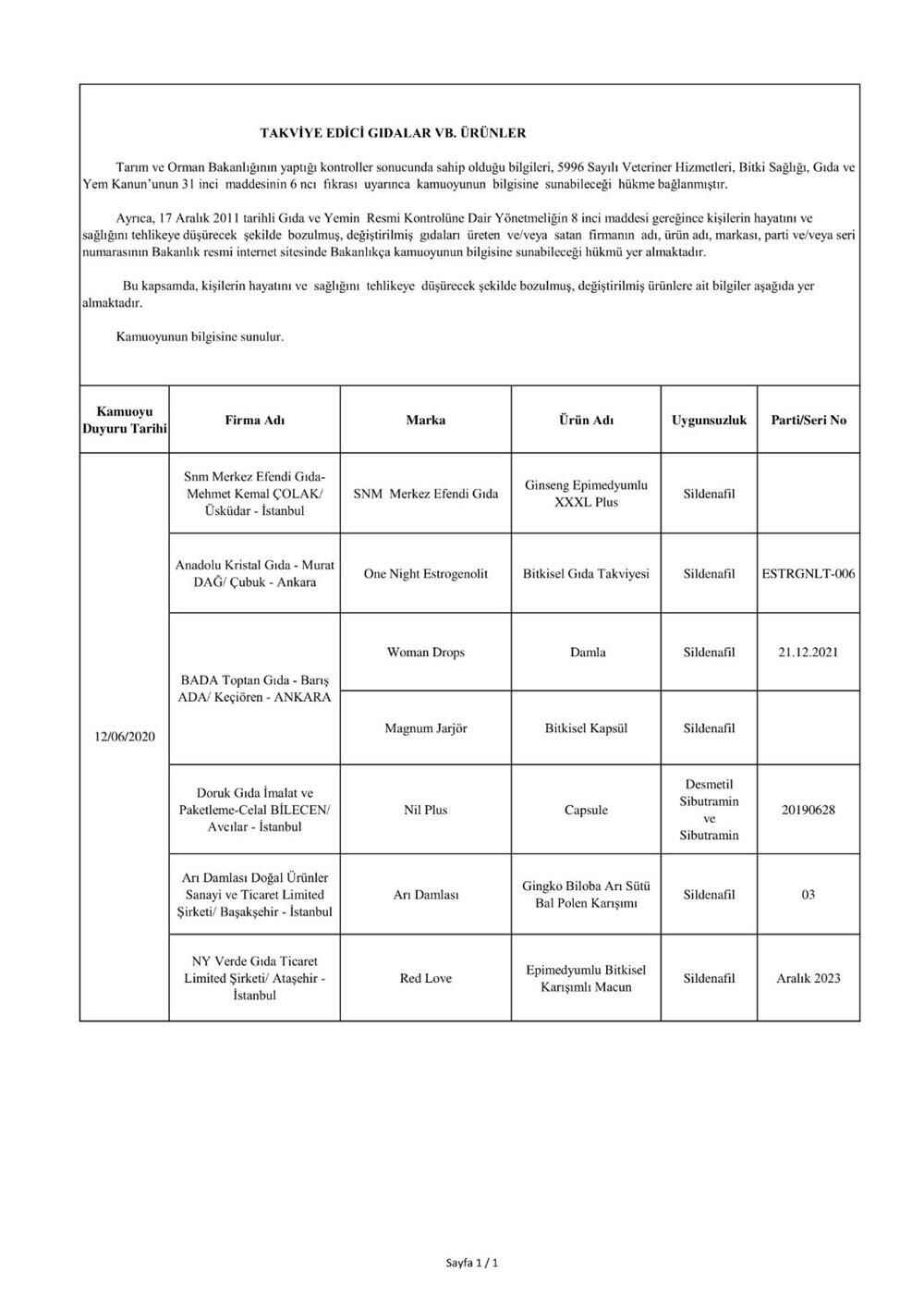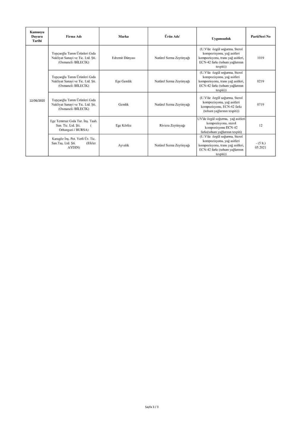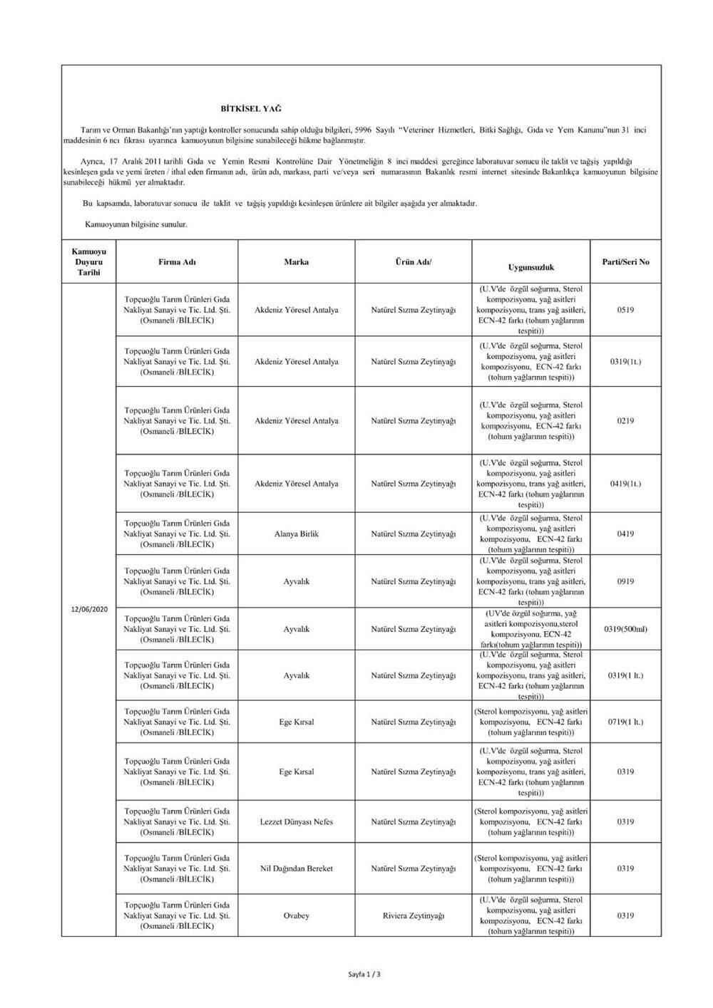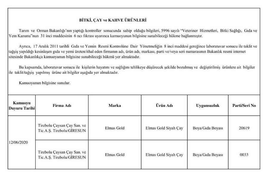 "5996 sayılı “Veteriner Hizmetleri, Bitki Sağlığı, Gıda ve Yem Kanunu” ve bu Kanun kapsamında hazırlanan, “Gıda ve Yemin Resmi Kontrollerine Dair Yönetmelik” gereğince; laboratuvar sonucuyla taklit veya tağşiş yapıldığı kesinleşen gıdaları üreten/ithal eden; kişilerin hayatını ve sağlığını tehlikeye düşürecek şekilde bozulmuş, değiştirilmiş gıdaları üreten ve/veya satan firmanın adı, ürün adı, markası, parti ve/veya seri numarasını içeren bilgiler kamuoyunun bilgisine sunulmaktadır.