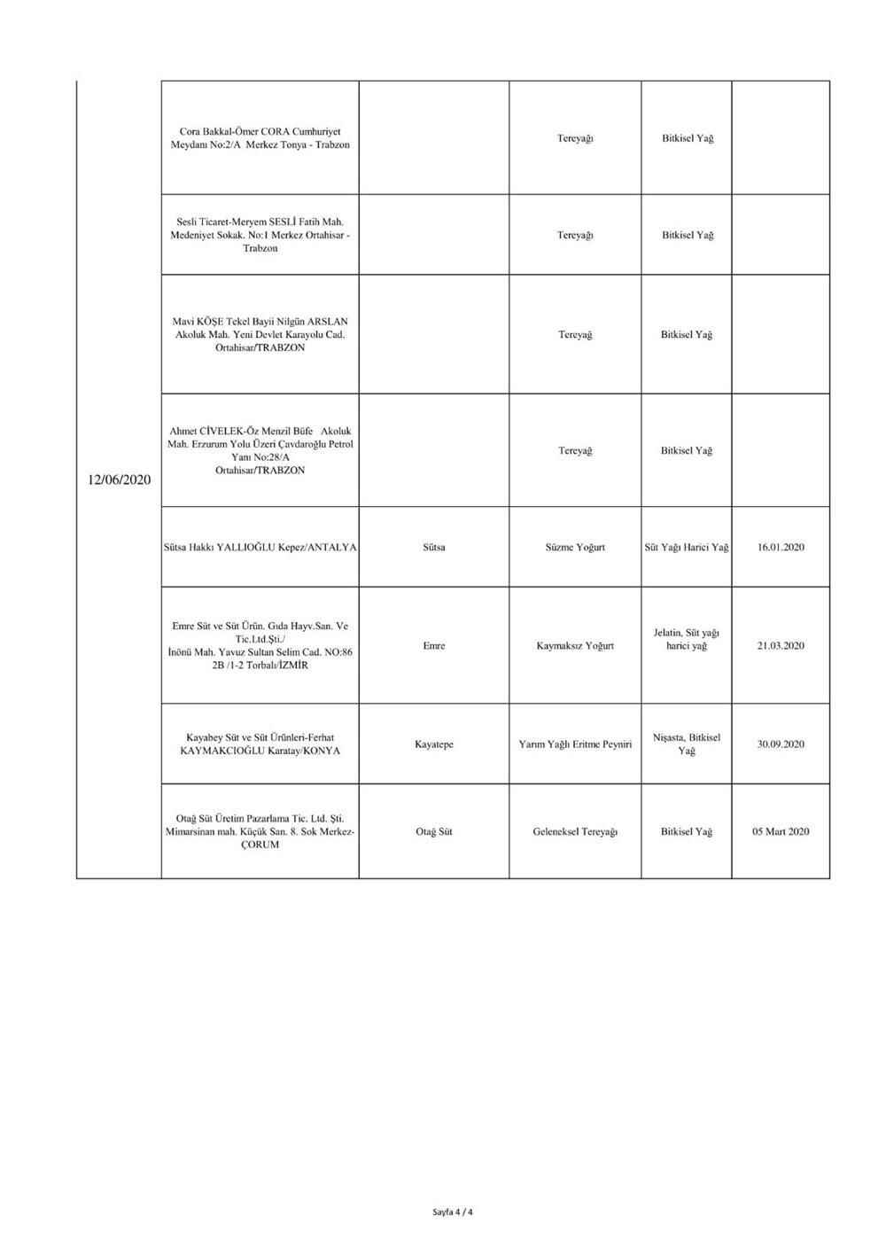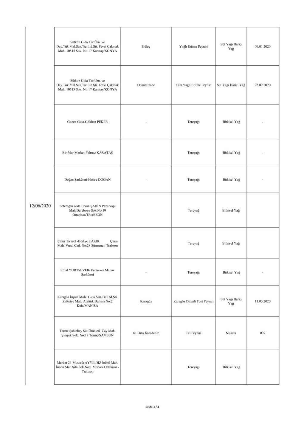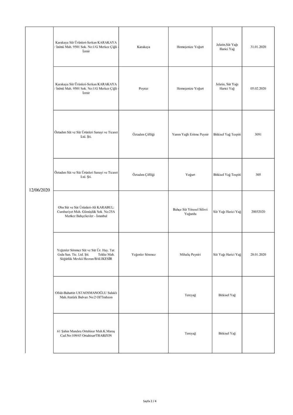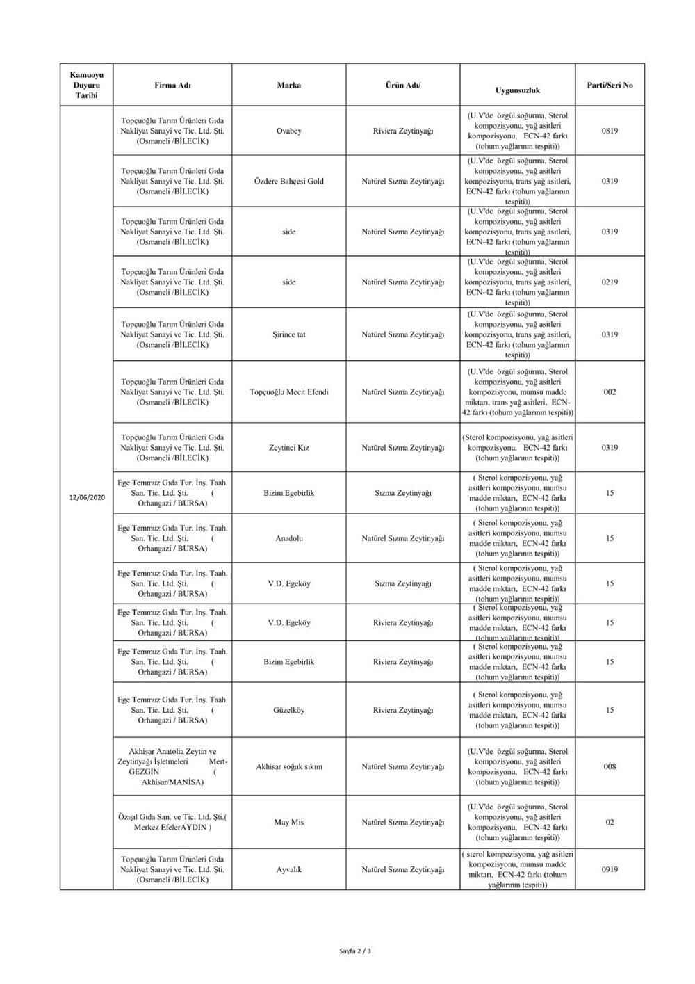 "5996 sayılı “Veteriner Hizmetleri, Bitki Sağlığı, Gıda ve Yem Kanunu” ve bu Kanun kapsamında hazırlanan, “Gıda ve Yemin Resmi Kontrollerine Dair Yönetmelik” gereğince; laboratuvar sonucuyla taklit veya tağşiş yapıldığı kesinleşen gıdaları üreten/ithal eden; kişilerin hayatını ve sağlığını tehlikeye düşürecek şekilde bozulmuş, değiştirilmiş gıdaları üreten ve/veya satan firmanın adı, ürün adı, markası, parti ve/veya seri numarasını içeren bilgiler kamuoyunun bilgisine sunulmaktadır.