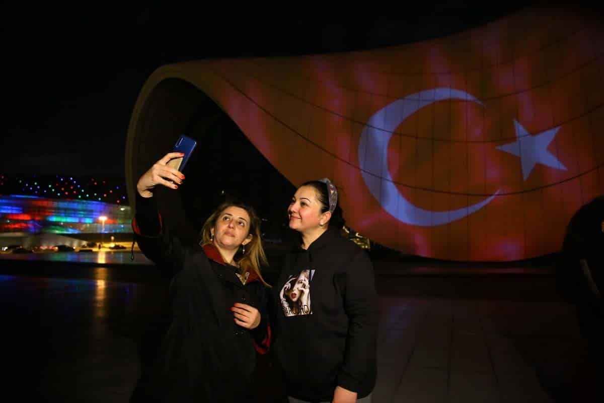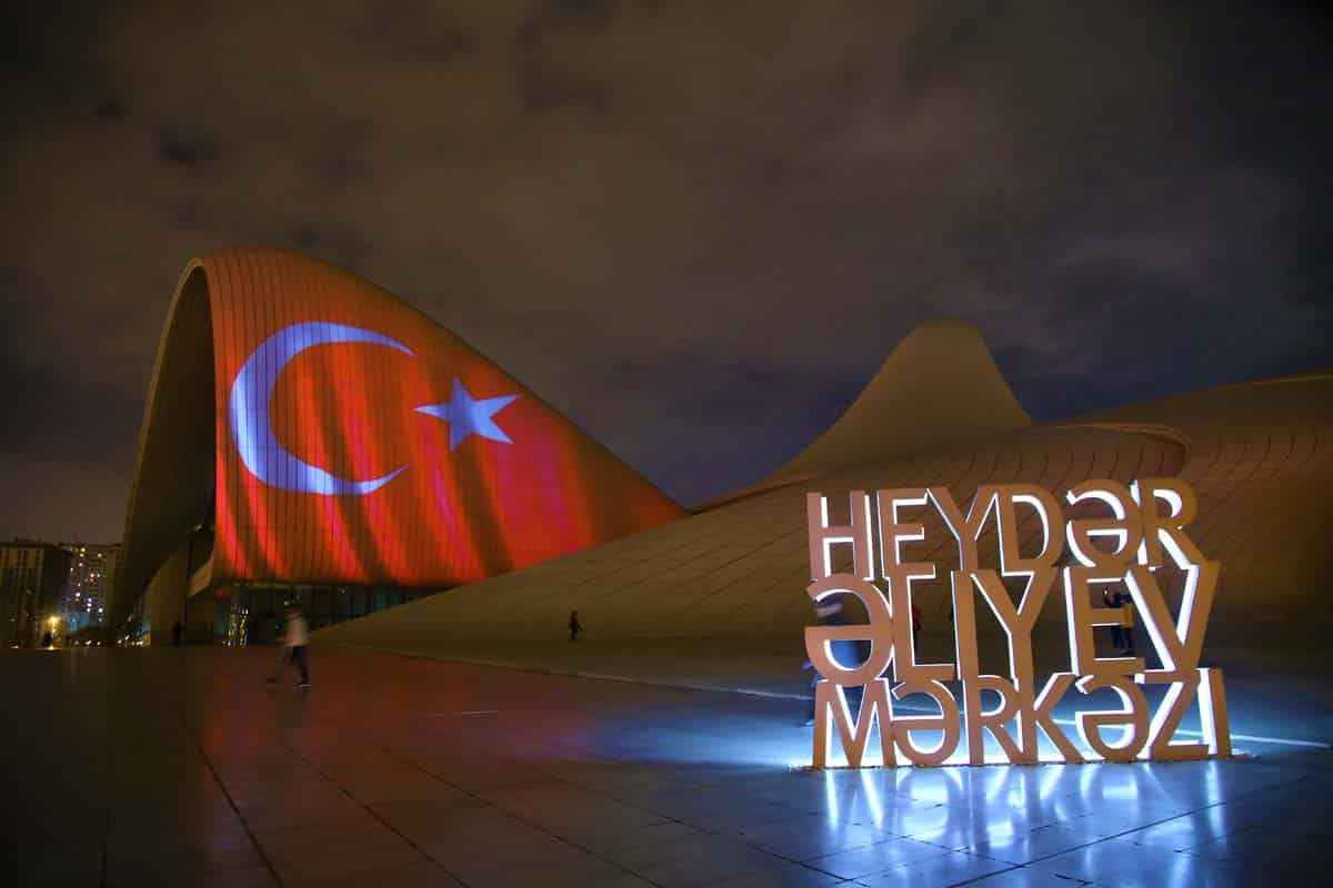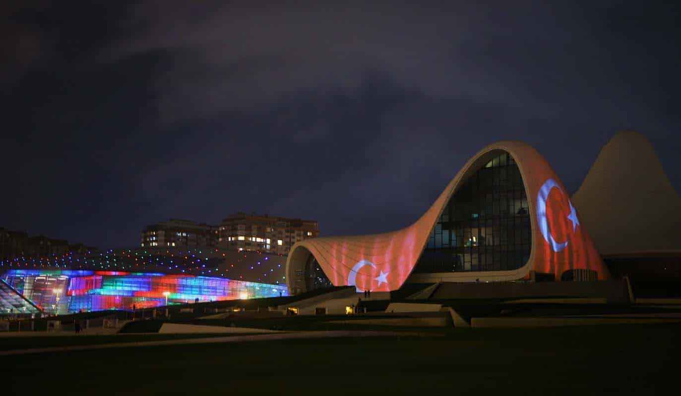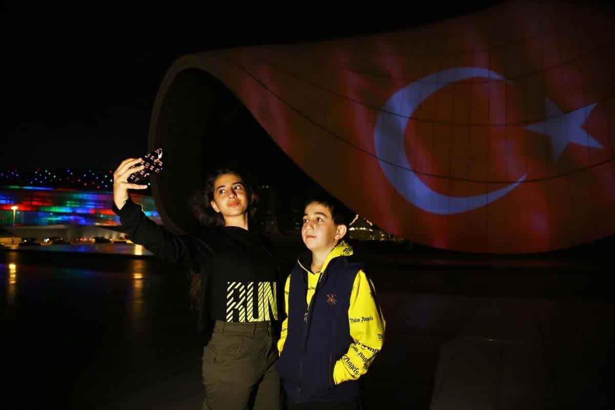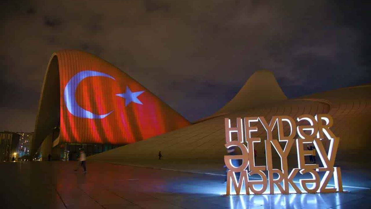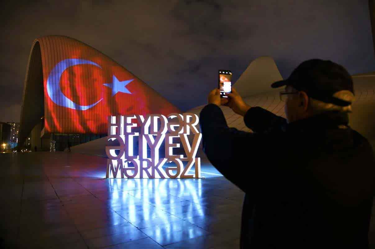 29 Ekim Cumhuriyet Bayramı dolayısıyla Türk bayrağı yansıtılan Bakü Olimpik Stadı ve Haydar Aliyev Merkezi'nden Türk müzikleri de seslendirildi.