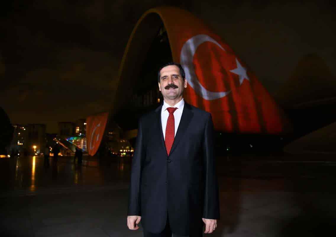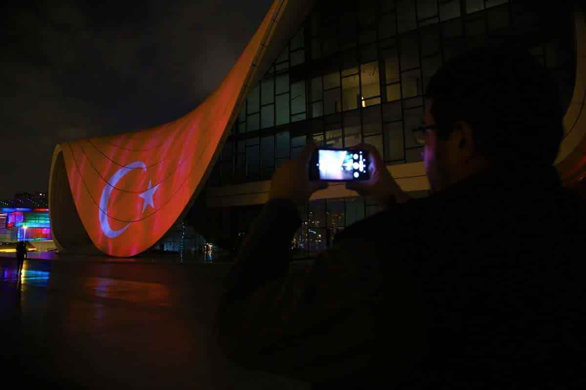 Haydar Aliyev Merkezi'nin dış cephesinde Türk bayrağı yansıtılmasını Türkiye'nin Bakü Büyükelçisi Erkan Özoral da izledi.