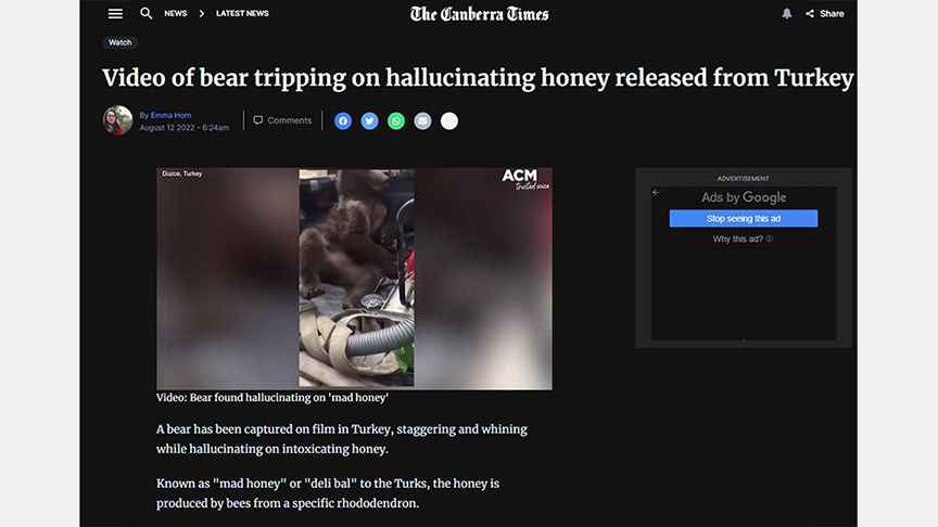 The Canberra Times`ta "Ayı `deli bal`da halüsinasyon gördü" video başlığı ile haber paylaşıldı. Haberde ayının sağlık durumuna ilişkin bilgi de verildi.