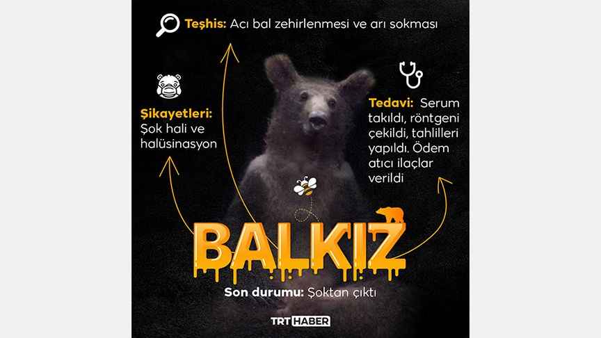 Balkız`a acı bal zehirlenmesi ve arı sokması teşhisi konuldu. Şoktan çıkan Balkız`ın durumu iyi.