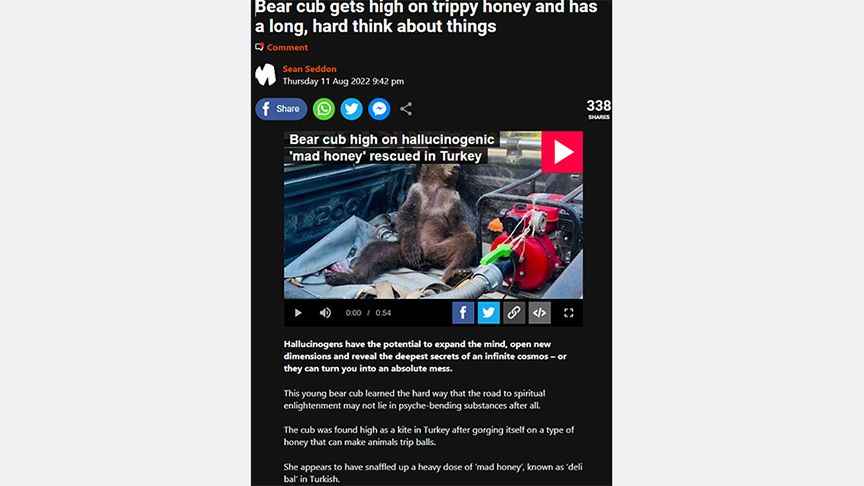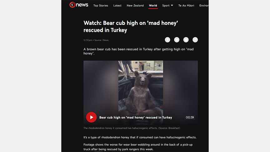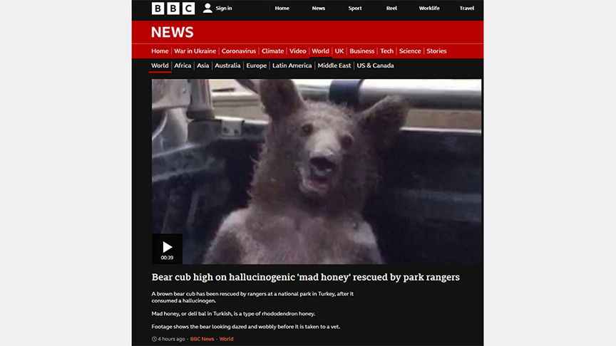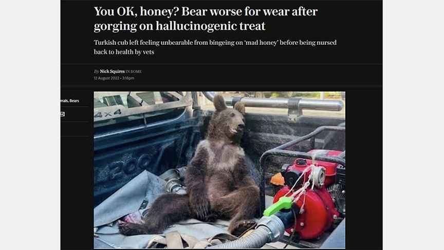 İngiliz haber ajansı BBC, "Park korucuları tarafından kurtarılan çok fazla `deli bal` tüketen halüsinojenik ayı yavrusu" şeklinde haberi duyurdu.