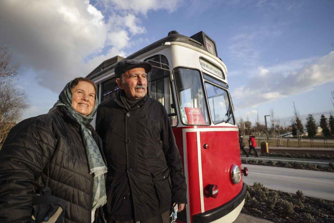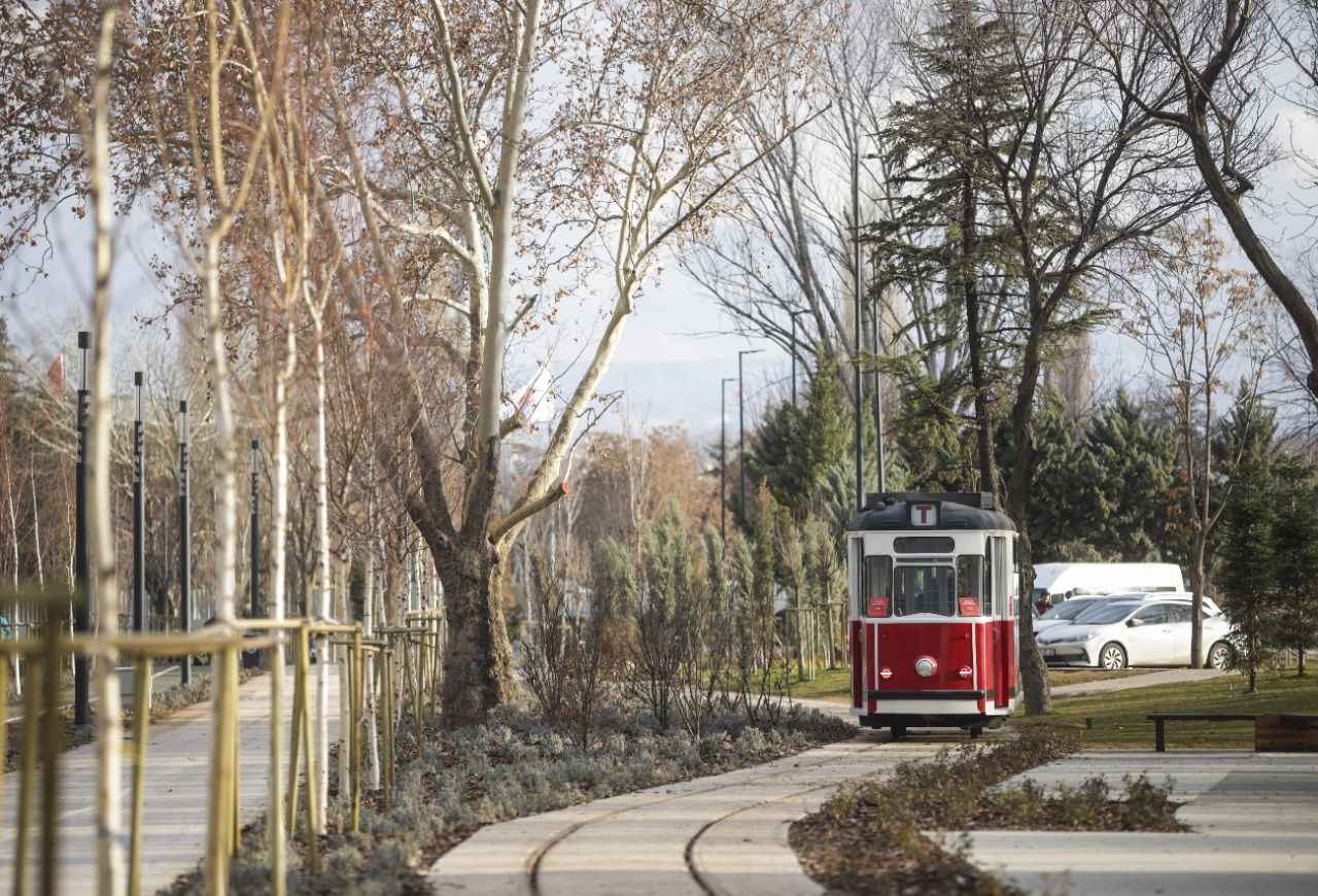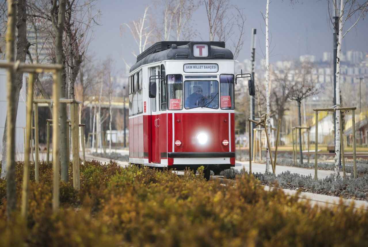 Dış rengi kırmızı içi de ahşap oturaklardan oluşan tramvay, Ankaralıları bir yandan zamanda yolculuğa çıkarırken diğer yandan yeşilin her tonunun görüldüğü peyzaj düzenlemeleriyle dikkati çeken Millet Bahçesi'ni gezme imkanı sunuyor.