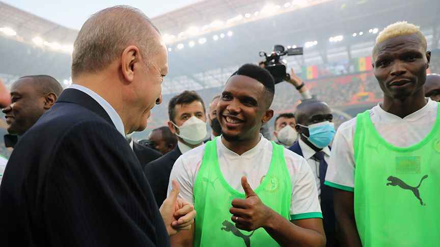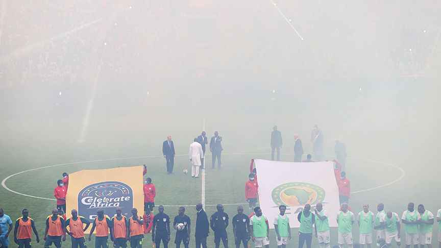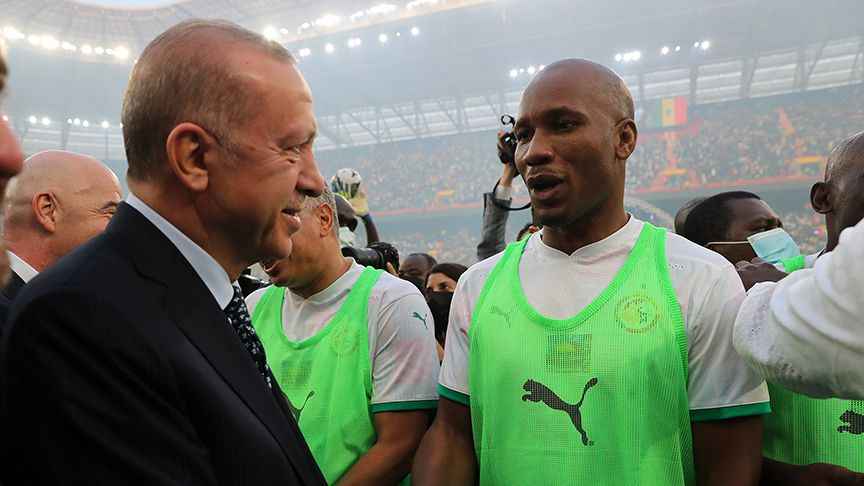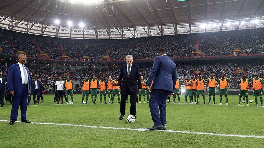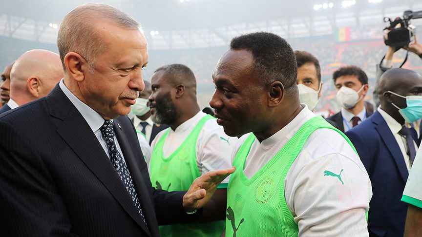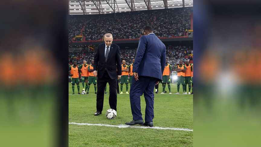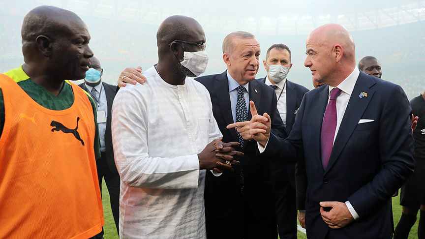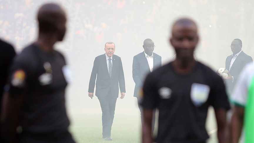 Gala maçı için sahaya çıkan Afrikalı eski oyuncular ve Senegal Milli Takımı'nın eski oyuncularıyla selamlaşan Cumhurbaşkanı Erdoğan, mevkidaşı Macky Sall ve diğer devlet başkanları futbolcularla paslaştı.