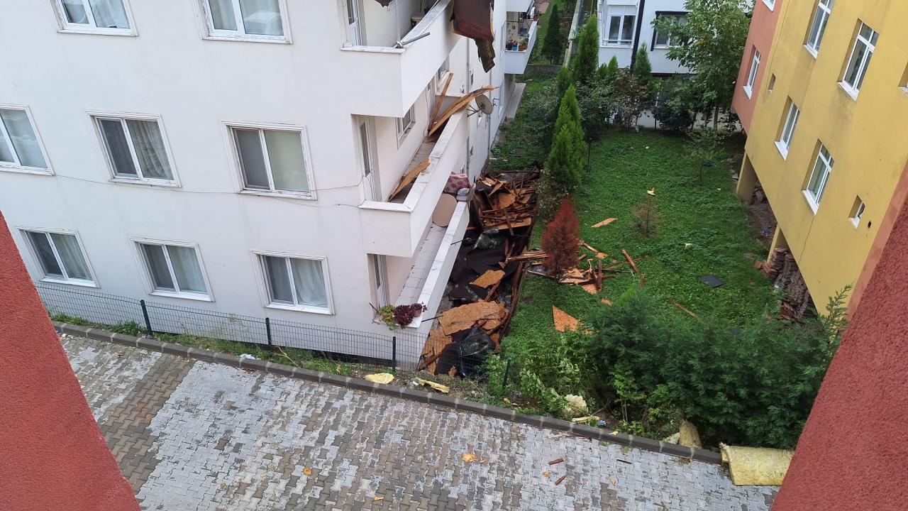 Kocaeli`nin Körfez ilçesinde 4 katlı binanın çatısı, fırtına nedeniyle yan binanın üzerine uçtu.