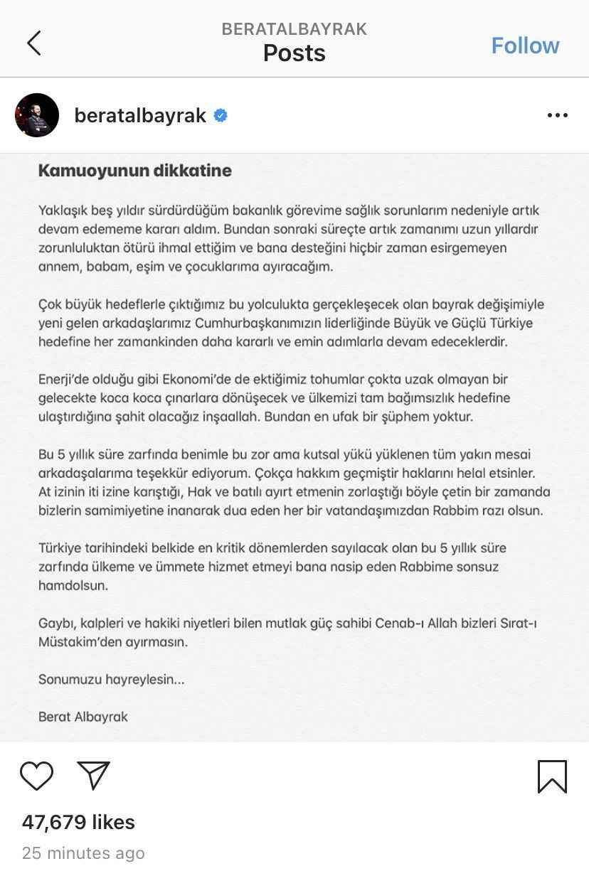 Hazine ve Maliye Bakanı Bert Albayrak'ın resmi Instagram hesabından yapılan paylaşımda şu ifadelere yer verildi. Bert Albayrak'ın istifa edip etmediği yetkililerden gelecek açıklama ile belli olacak.