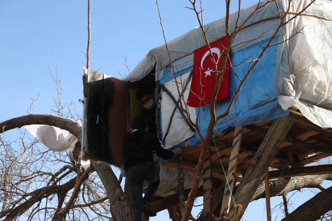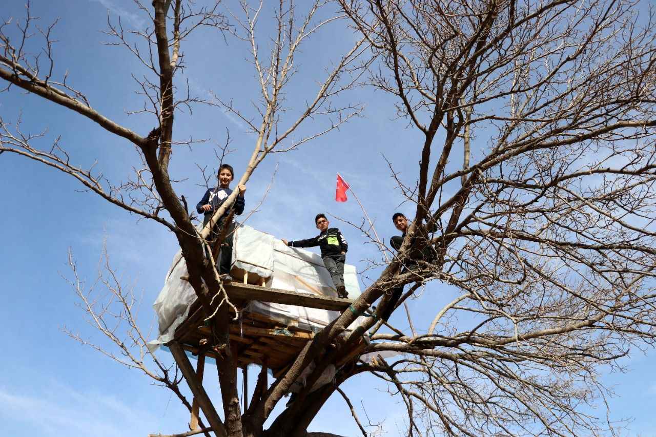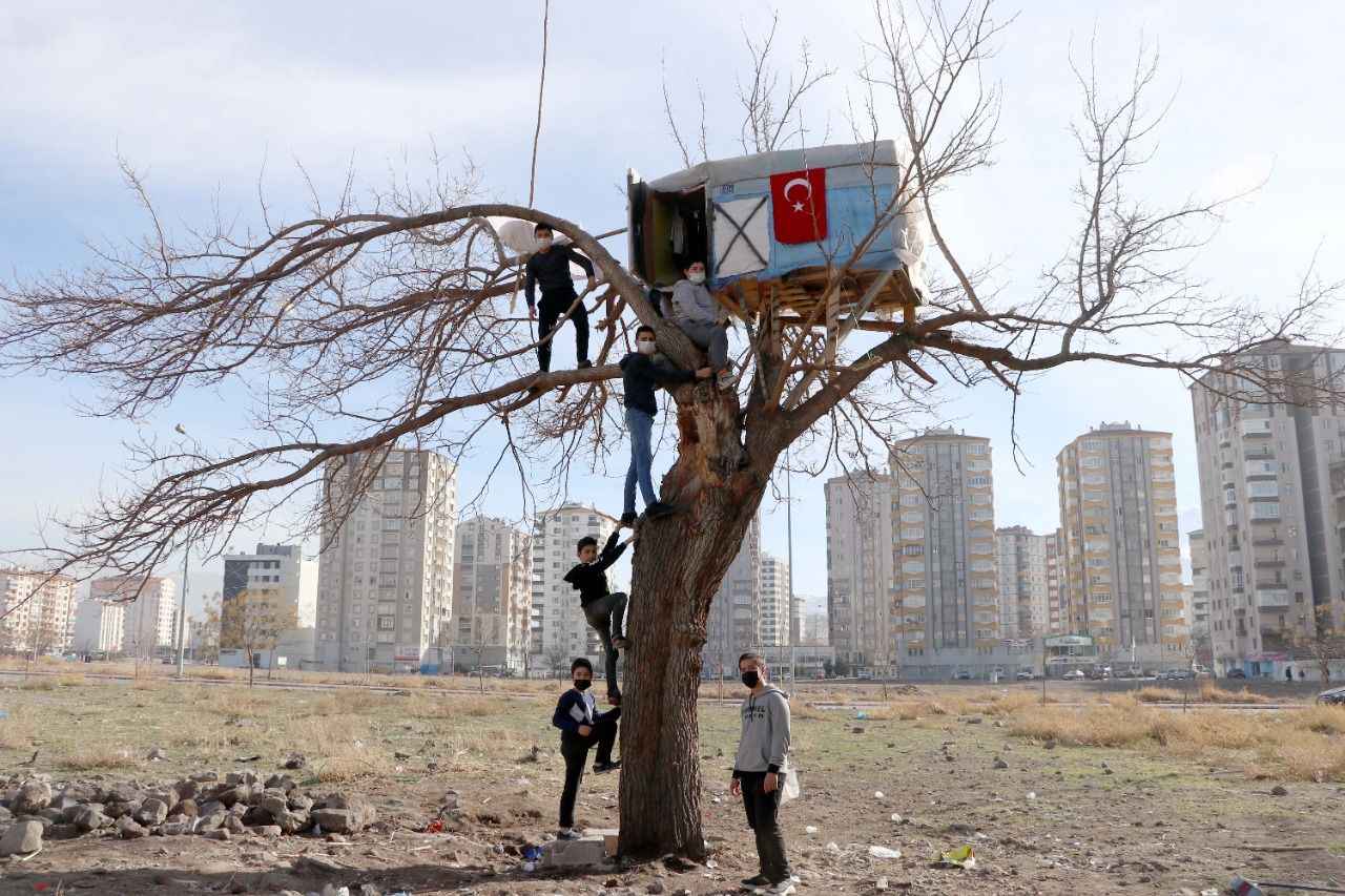 Caferbey Mahallesi'nde, Kovid-19 salgını nedeniyle dışarıya çıkışları kısıtlanan bir grup çocuk, kendilerine farklı oyun alanı oluşturmak için kurumuş bir ağacın dallarına kulübe yapmaya karar verdi.