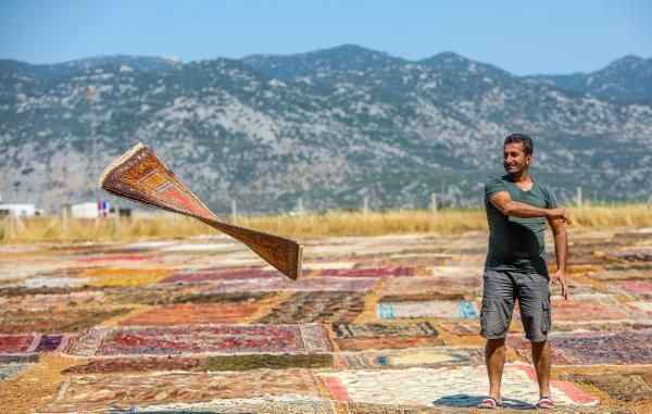 Bir halının yünleri içindeki fazla boyanın buhar olup, uçması için güneş banyosunun şart olduğunu aktaran Börekçi, "Halı tarlaları halının gerçek kimliğini ortaya çıkarmak için çok önemli. O nedenle bir halı günlerce güneşin altında bekletiliyor" dedi.