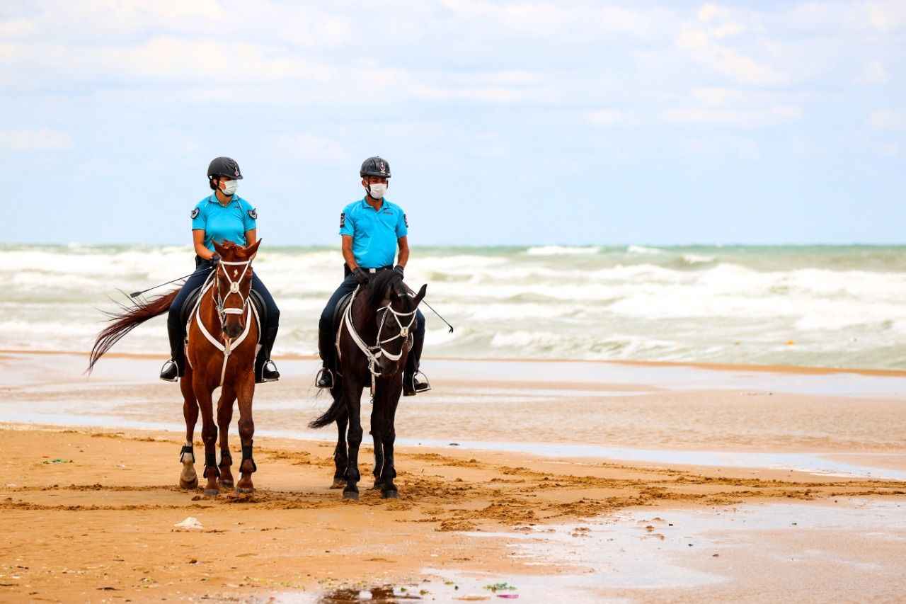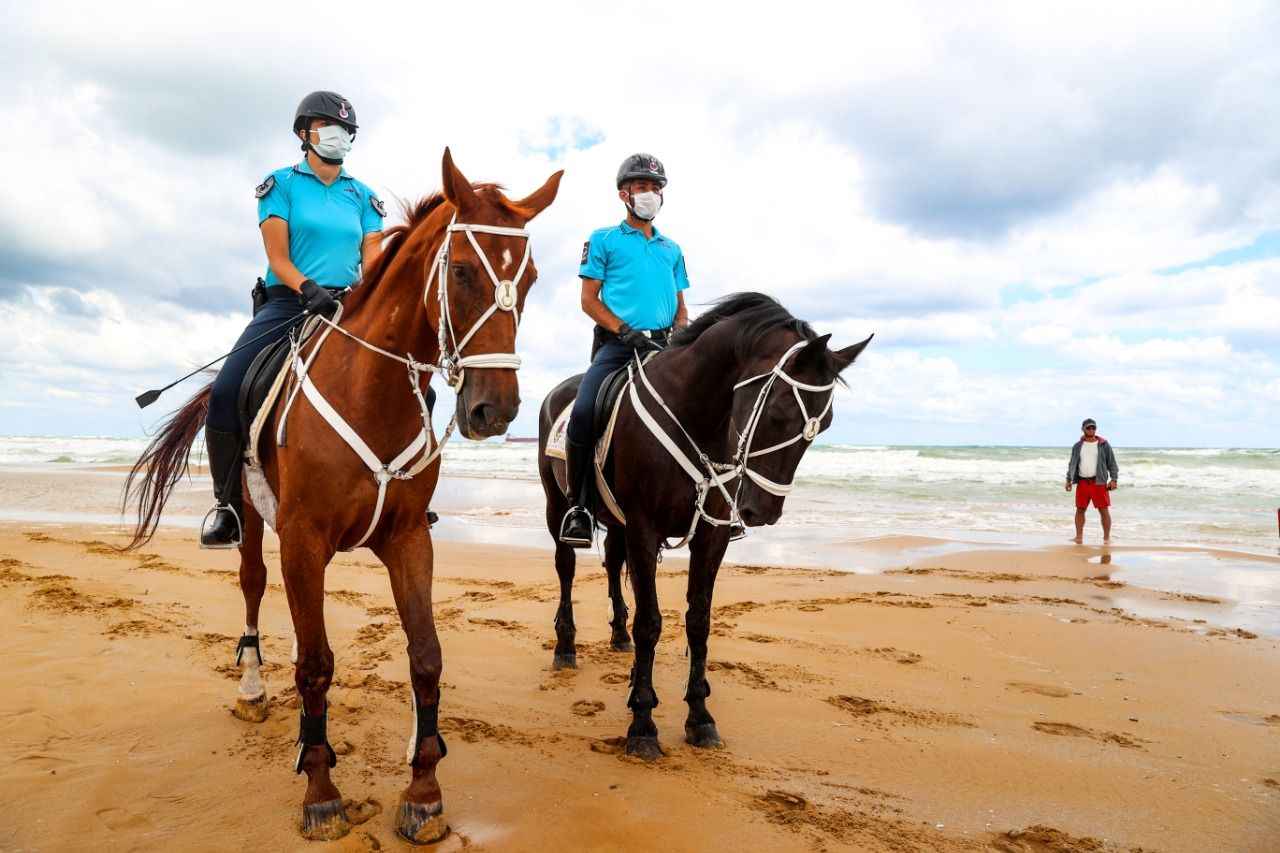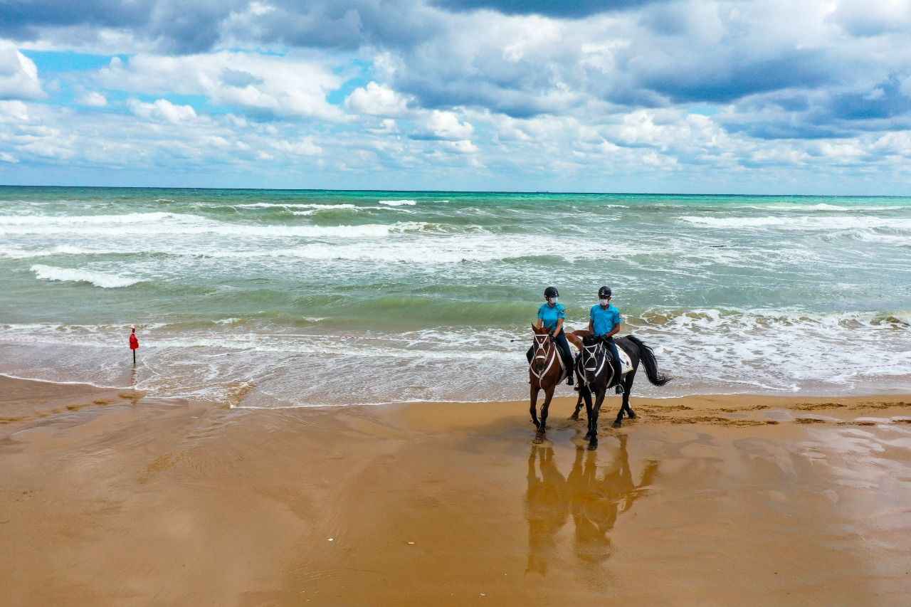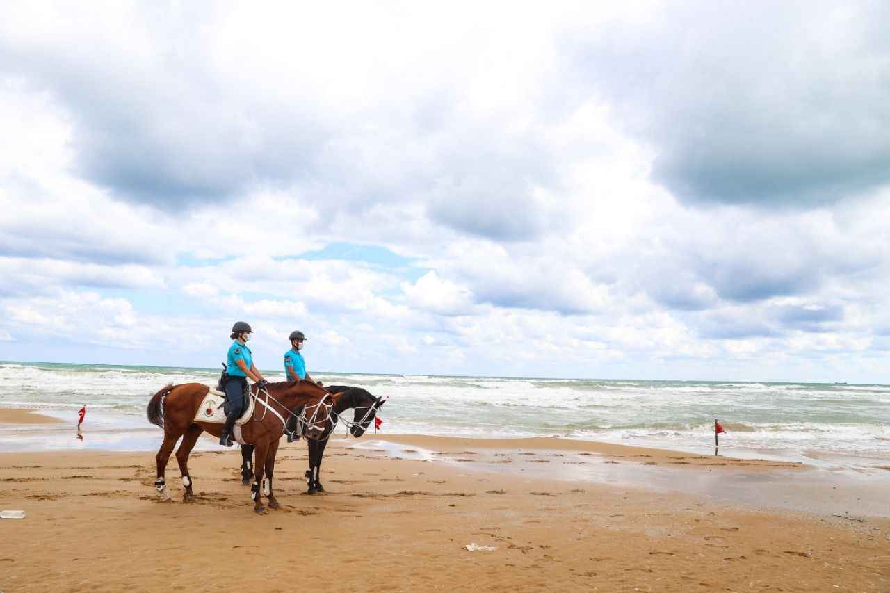 Sarıyer Gümüşdere Plajı'nda atlı timle denetim yapan ekipler, olumsuz hava şartları ve aşırı dalga nedeniyle vatandaşların denize girmesinin tehlikeli ve yasak olduğunu duyurdu.