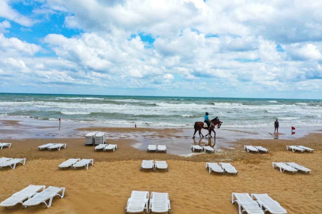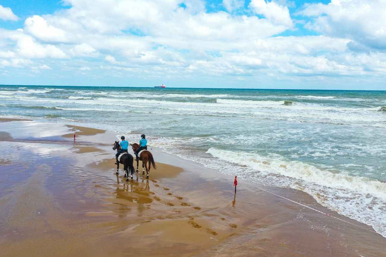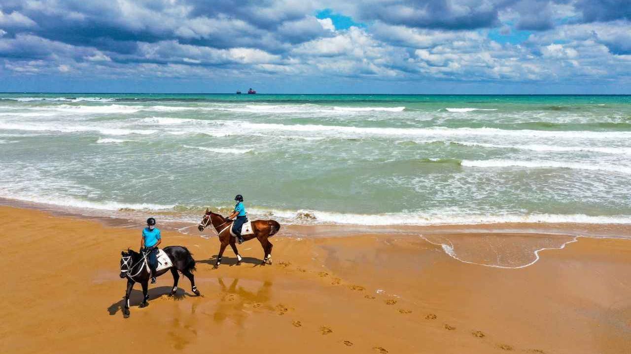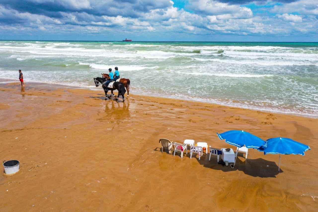 Sarıyer Gümüşdere Plajı'nda atlı timle denetim yapan ekipler, olumsuz hava şartları ve aşırı dalga nedeniyle vatandaşların denize girmesinin tehlikeli ve yasak olduğunu duyurdu.
