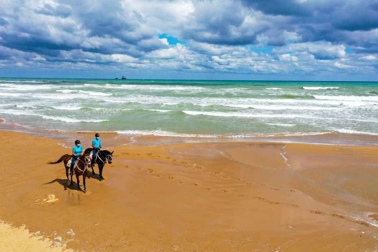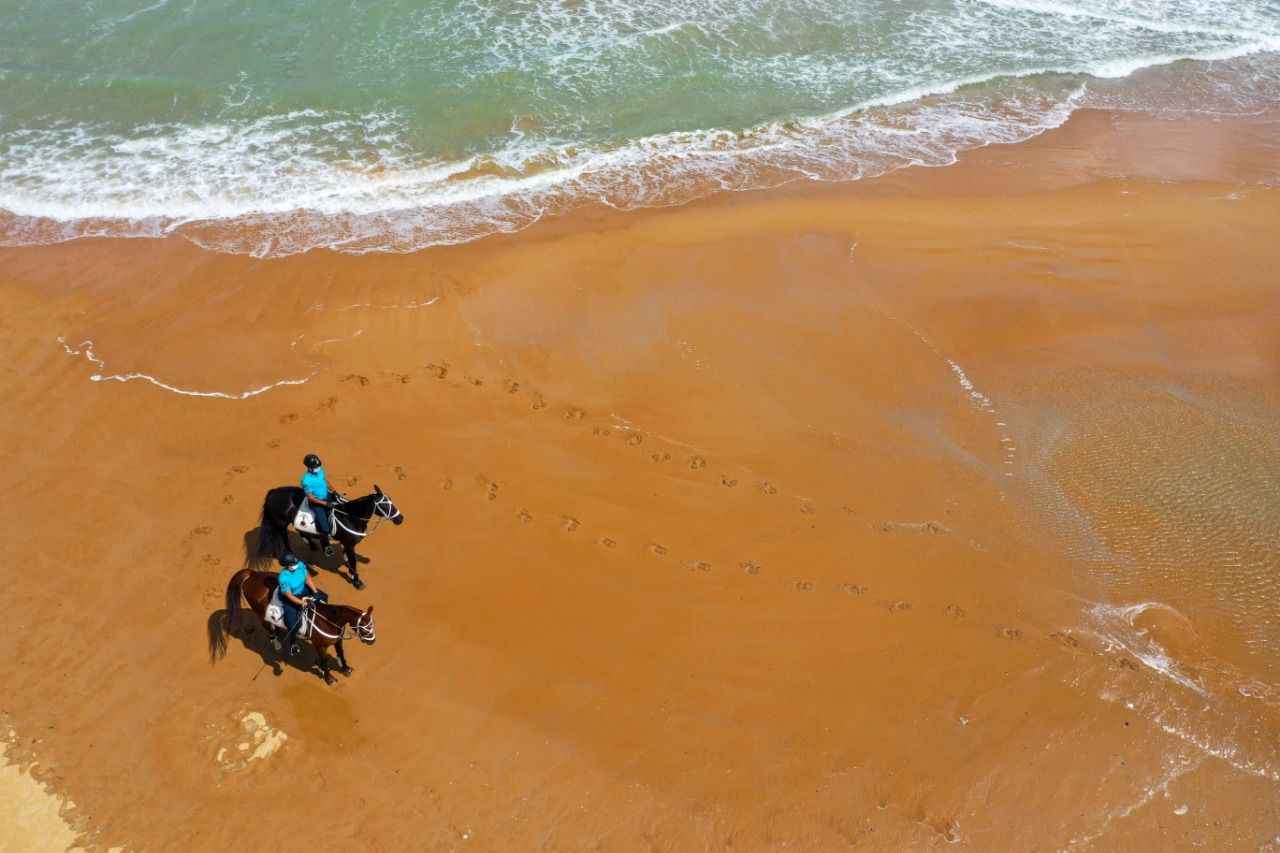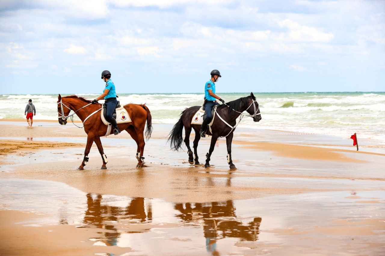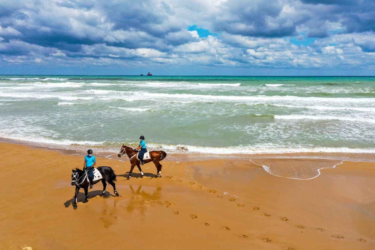 Sarıyer Gümüşdere Plajı'nda atlı timle denetim yapan ekipler, olumsuz hava şartları ve aşırı dalga nedeniyle vatandaşların denize girmesinin tehlikeli ve yasak olduğunu duyurdu.