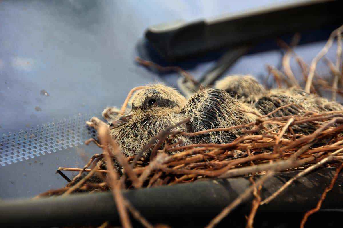 Kamyonetin ön camındaki yuvadaki yumurtalardan çıkan 2 kumru yavrusu dünyaya gözlerini açtı.
