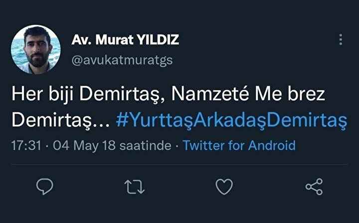 Terör soruşturmaları kapsamında tutuklu bulunan HDP'li Selahattin Demirtaş için attığı "Her biji Demirtaş" tweet'i sorulan CHP İstanbul İl Hukuk Komisyonu Üyesi Murat Yıldız ise kendisini, "Demokrasi için bir fırsat verdik" diyerek savundu.