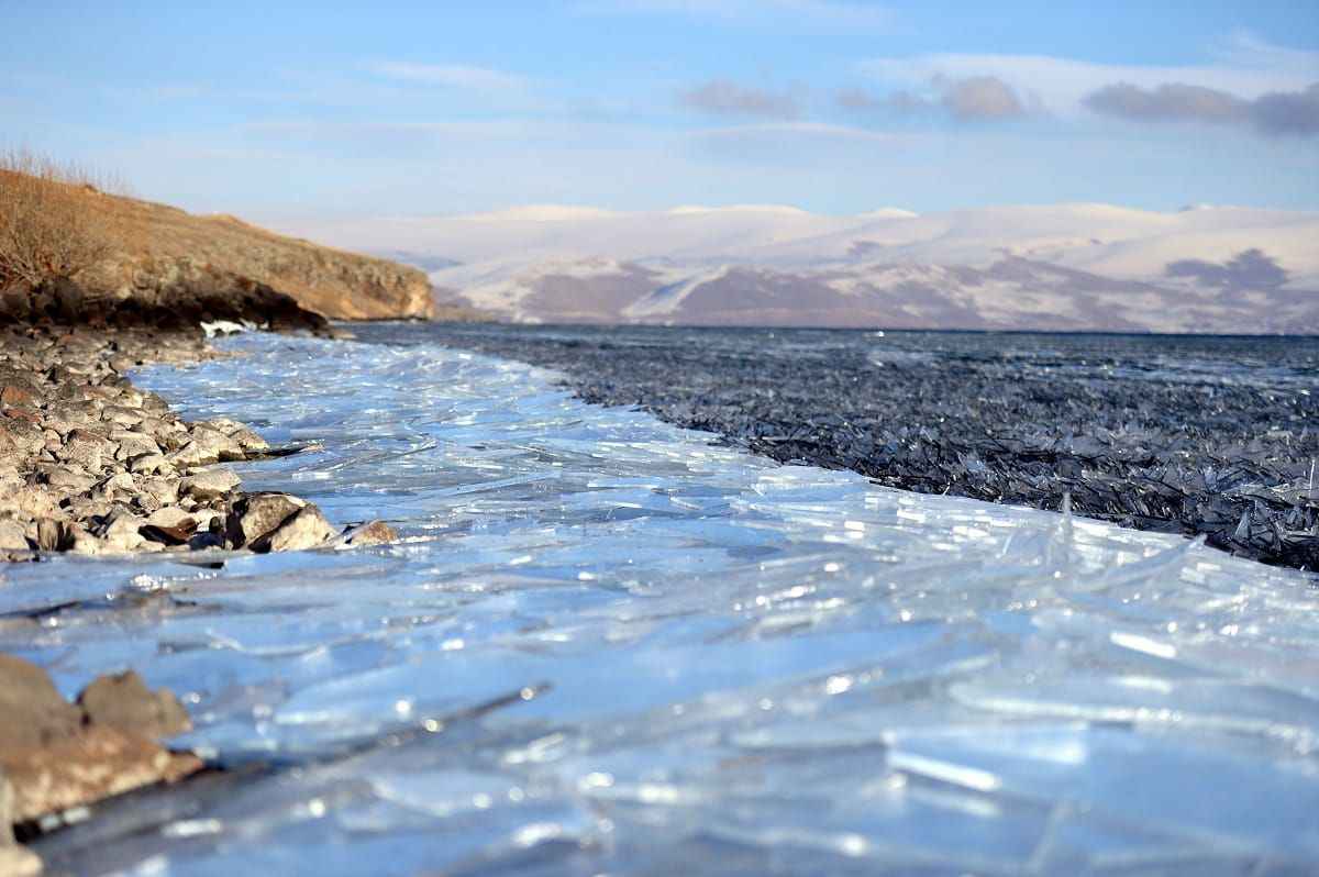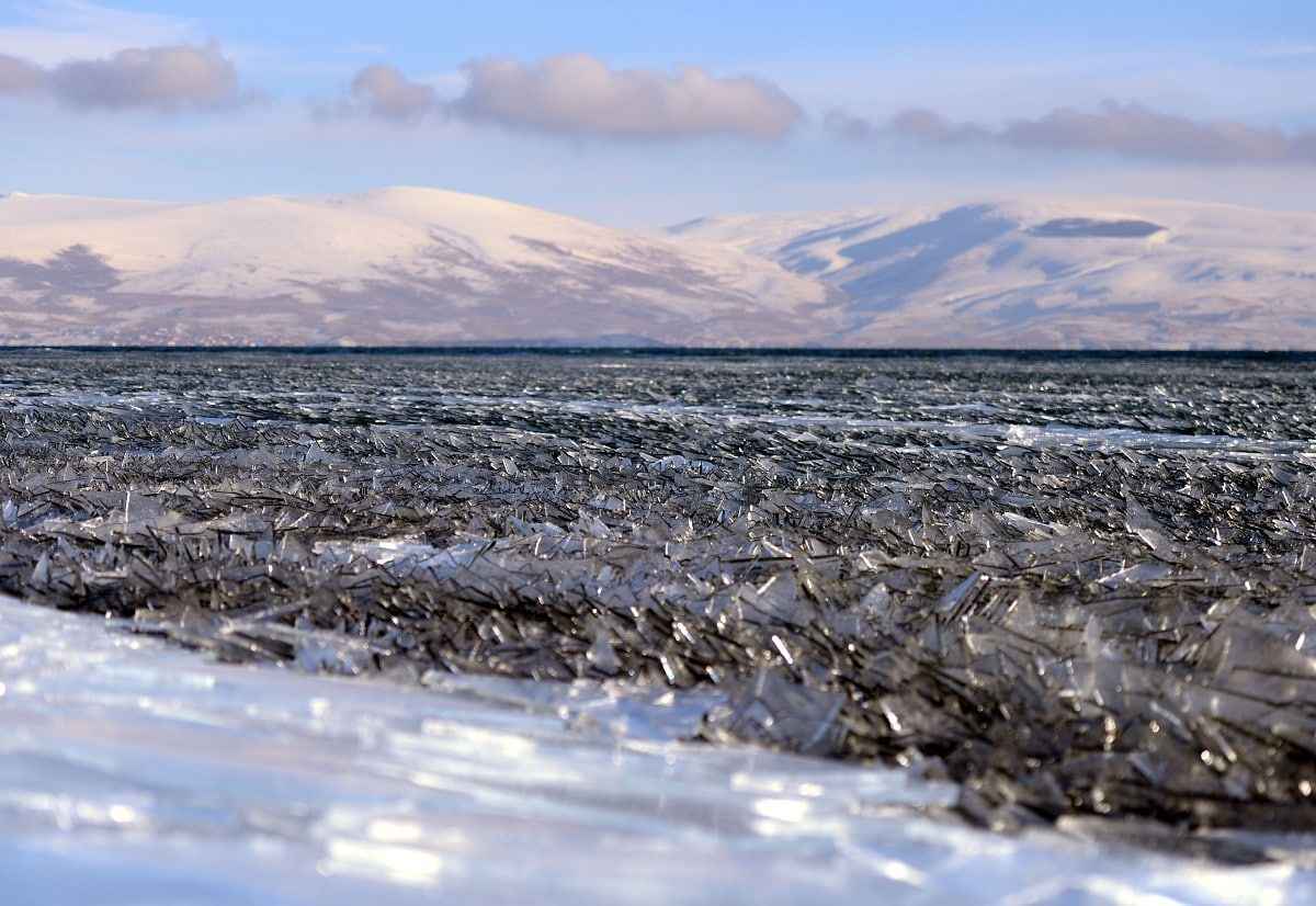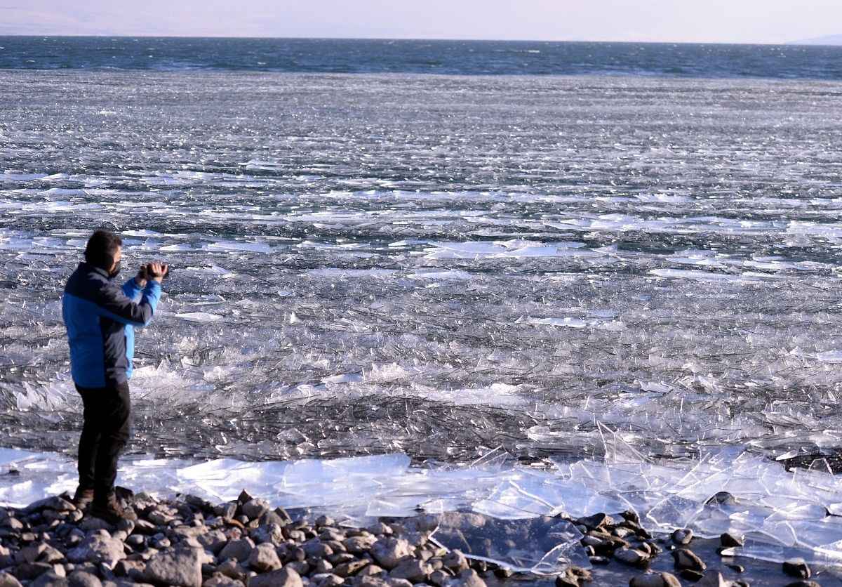 Çıldır Gölü'nde rüzgarın oluşturduğu dalgaların etsisiyle kırılan ince buz parçacıkları, görsel şölene dönüşüyor.