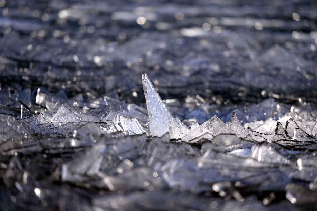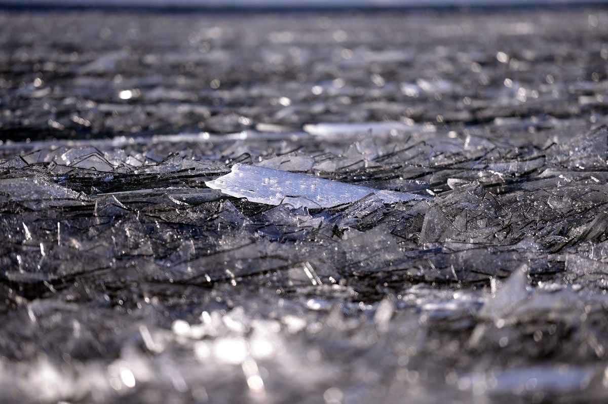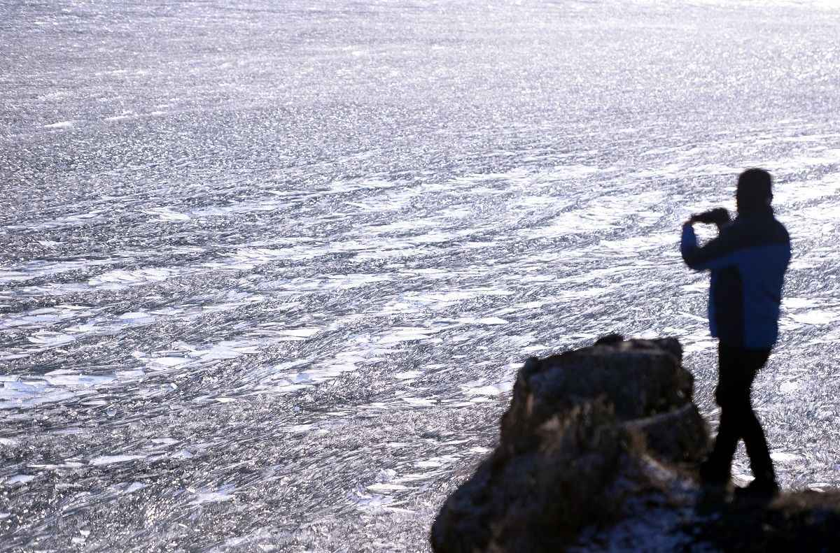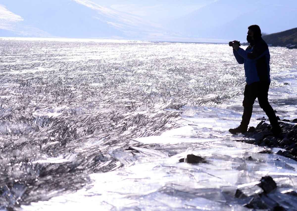 Çıldır Gölü'nde rüzgarın oluşturduğu dalgaların etsisiyle kırılan ince buz parçacıkları, görsel şölene dönüşüyor.