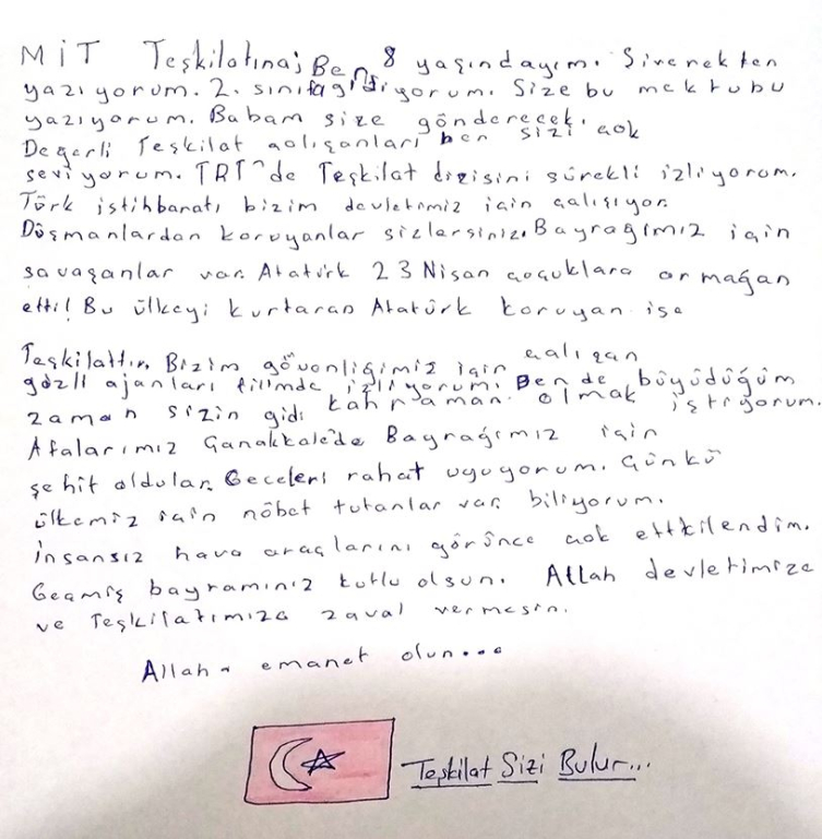 Milli İstihbarat Teşkilatı, çocuklardan teşkilata gelen mektupları yayımladı. İşte o mektuplardan bazıları...