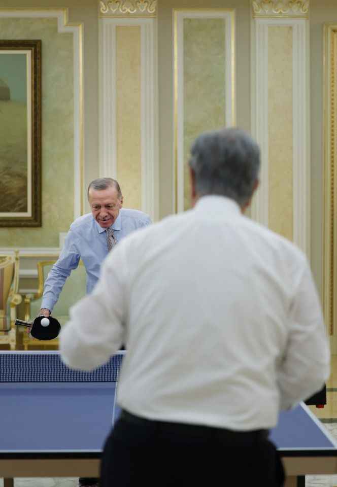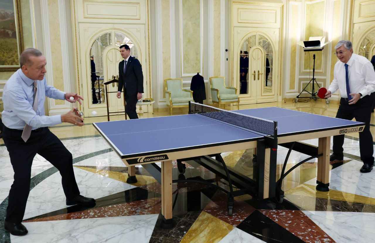 Cumhurbaşkanı Recep Tayyip Erdoğan, ziyarette bulunduğu Astana'da, Kazakistan Cumhurbaşkanı Kasım Cömert Tokayev ile görüştü. Görüşmeler sonrası Cumhurbaşkanı Erdoğan, Kazakistan Cumhurbaşkanı Tokayev ile masa tenisi oynadı. \n