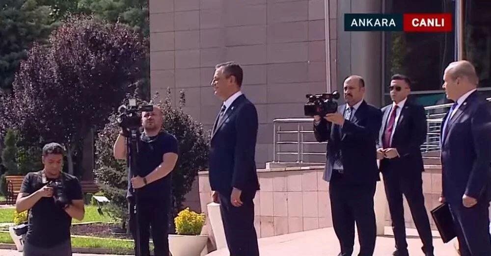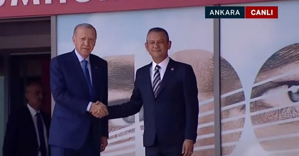 CHP Genel Başkanı Özgür Özel, Cumhurbaşkanı Erdoğan'ı genel merkezin kapısında karşıladı.