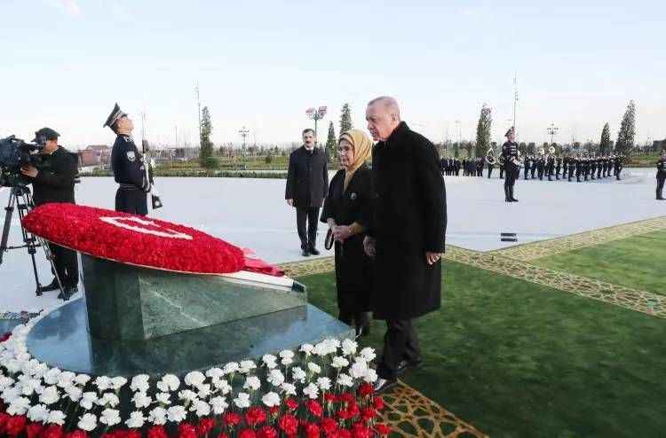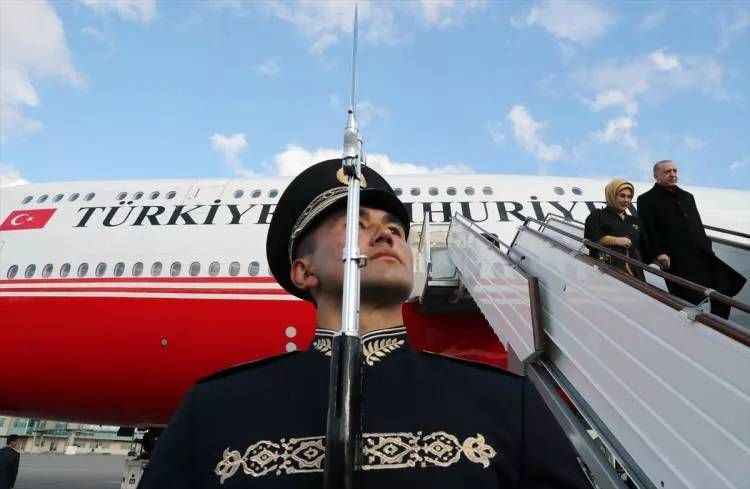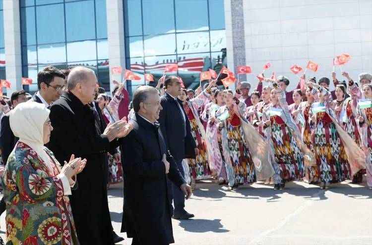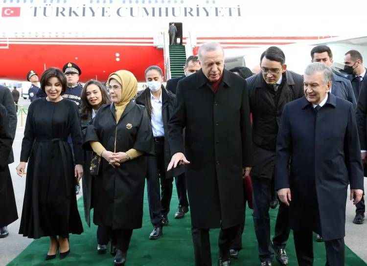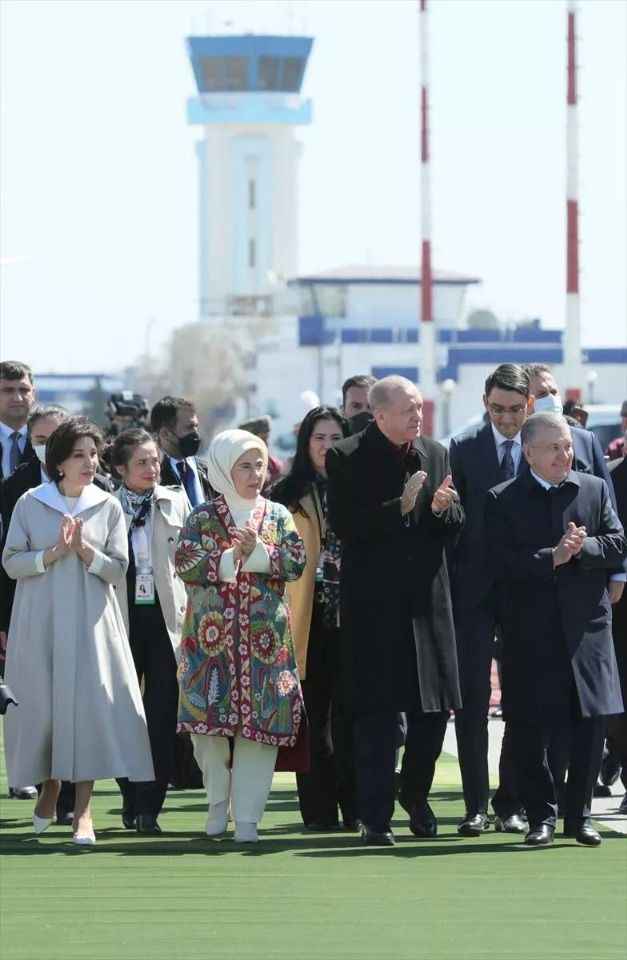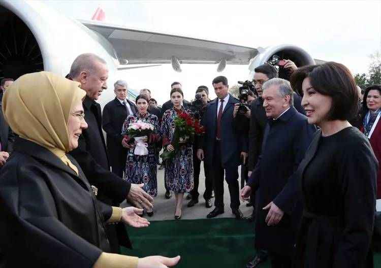 Erdoğan'ı, Taşkent Uluslararası Havalimanı'nda Özbekistan Cumhurbaşkanı Şevket Mirziyoyev ve eşi Ziroat Mirziyoyeva karşıladı.