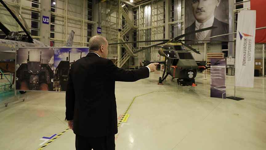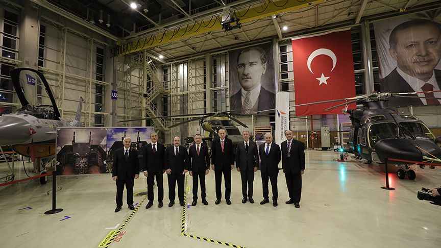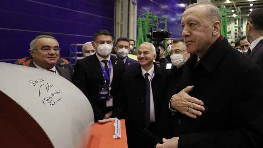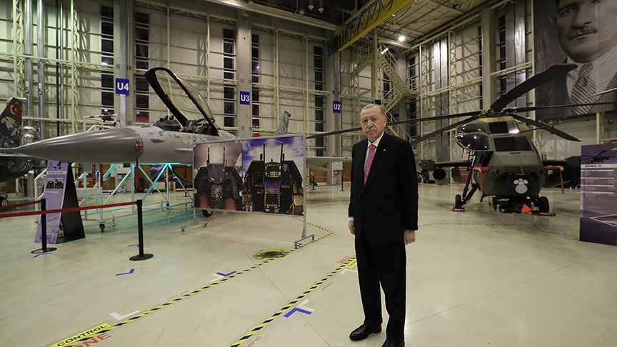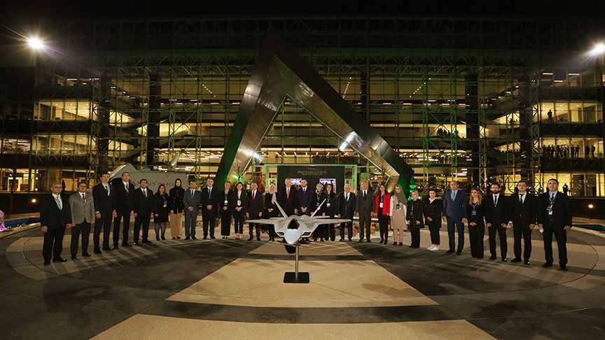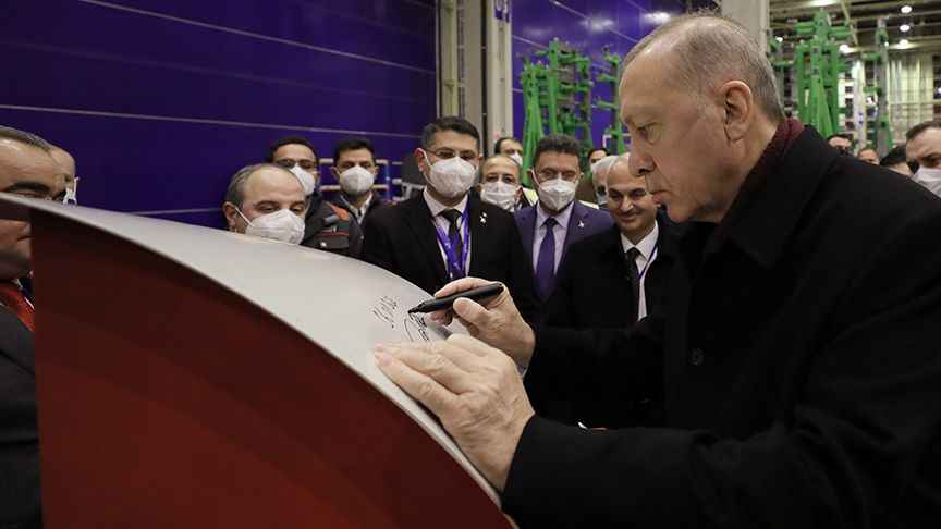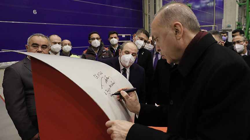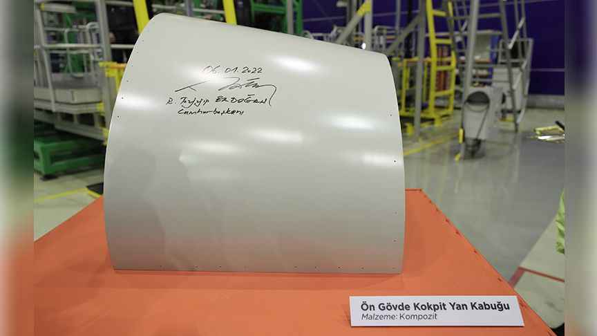 Açılış öncesi merkezde incelemelerde bulunan Cumhurbaşkanı Erdoğan, Milli Muharip Uçağın, kompozitten yapılan ön gövde kokpit yan kabuğunu imzaladı.