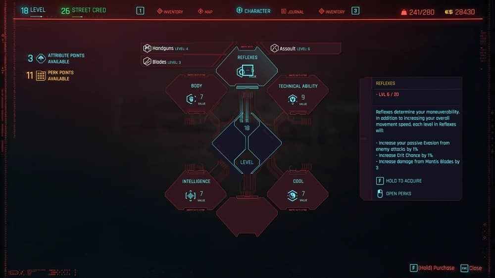 Oyun tarzınıza göre yaptığınız eylemler için de Yetenek İlerleme puanları alırsınız. Tabancaları çok kullanırsanız, tabanca kullanmak için bonusların kilidini açan yetenek puanları alırsınız. Bu, oyunu nasıl oynadığınıza bağlı olarak V’nizi geliştirmenide izin verir ancak aynı zamanda puanlarınızı belirli becerilere harcamak istemeseniz de bonuslar alabileceğiniz anlamına gelir. Mesela V’niz bir Netrunner olmasa bile, hacklemeyi sık sık kullanmalısınız. İhlal Protokolü’nü kullanmak ve düşmanlar ve güvenlik kameraları gibi teknolojilerde düşük seviyeli hacklemeler yapmak size çok pahalıya mal olmaz ve yetenek ilerlemesi oluşturmanın kolay bir yoludur.