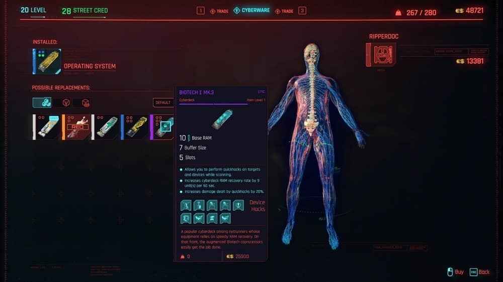 Cyberpunk 2077’de bir Netrunner veya hacker olarak oynamak istiyorsanız, başlangıçta sahip olduğunuz Cyberdeck ile fazla bir şey yapamayacağınızı bilin. Cyberdeckler ne kadar RAM’e sahip olduğunuzu belirler ve düşmanlara karşı kullanmak için hızlı hack almanıza izin verir. Sahip olduğunuz Cyberdeck ne kadar güzel olursa, kullanımınızda o kadar çok hızlı hack var demektir. RAM eklemek de önemlidir, çünkü tüm hızlı hacklerin kullanımı RAM’e mal olur ve zamanla yavaşça şarj olur. Temel Cyberdeck’inizde birkaç hızlı hack yuvası ve düşük RAM bulunur. Bu da düşmanları hackleme ve hatta güvenlik kameralarını uzaktan kapatma gibi yararlı işler yapma yeteneğinizi azaltır. Bir Cyberdeck, tam hacker rotasına girmeseniz bile iyi bir erken yatırımdır.