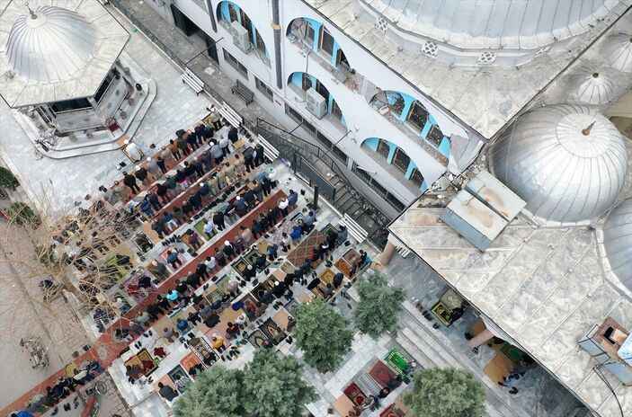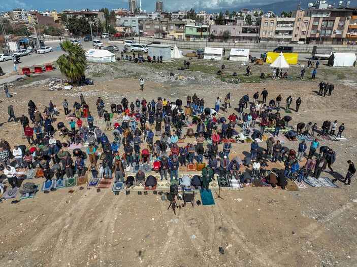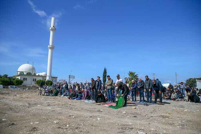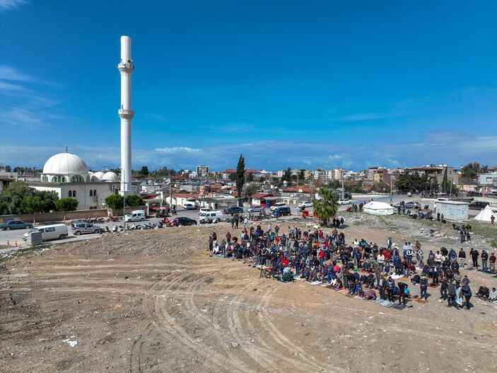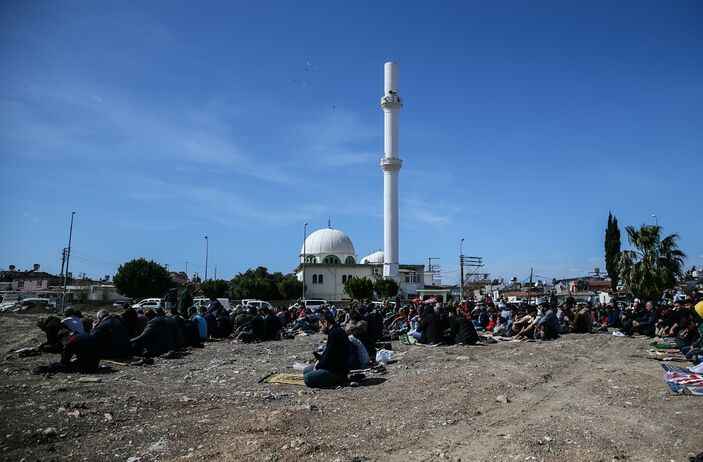 Depremin 33'üncü gününde cuma namazı için harekete geçen afetzedeler ve yardım için bölgede olan vatandaşlar, yıkılan camilerin avlusunda ve çadır kentlerde saf tuttu. İşte afet bölgesinde cuma namazı.