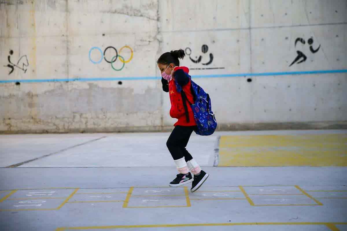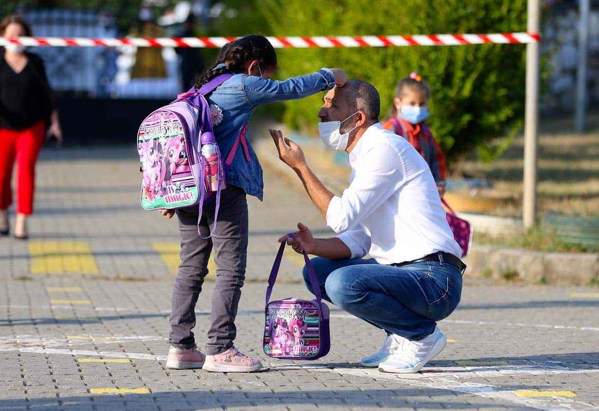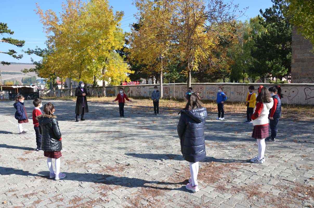 Yeni tip koronavirüs (Kovid-19) tedbirleri kapsamında okul bahçesinde sıraya giren öğrenciler, İstiklal Marşı'nın okunmasının ardından sınıflara alındı.