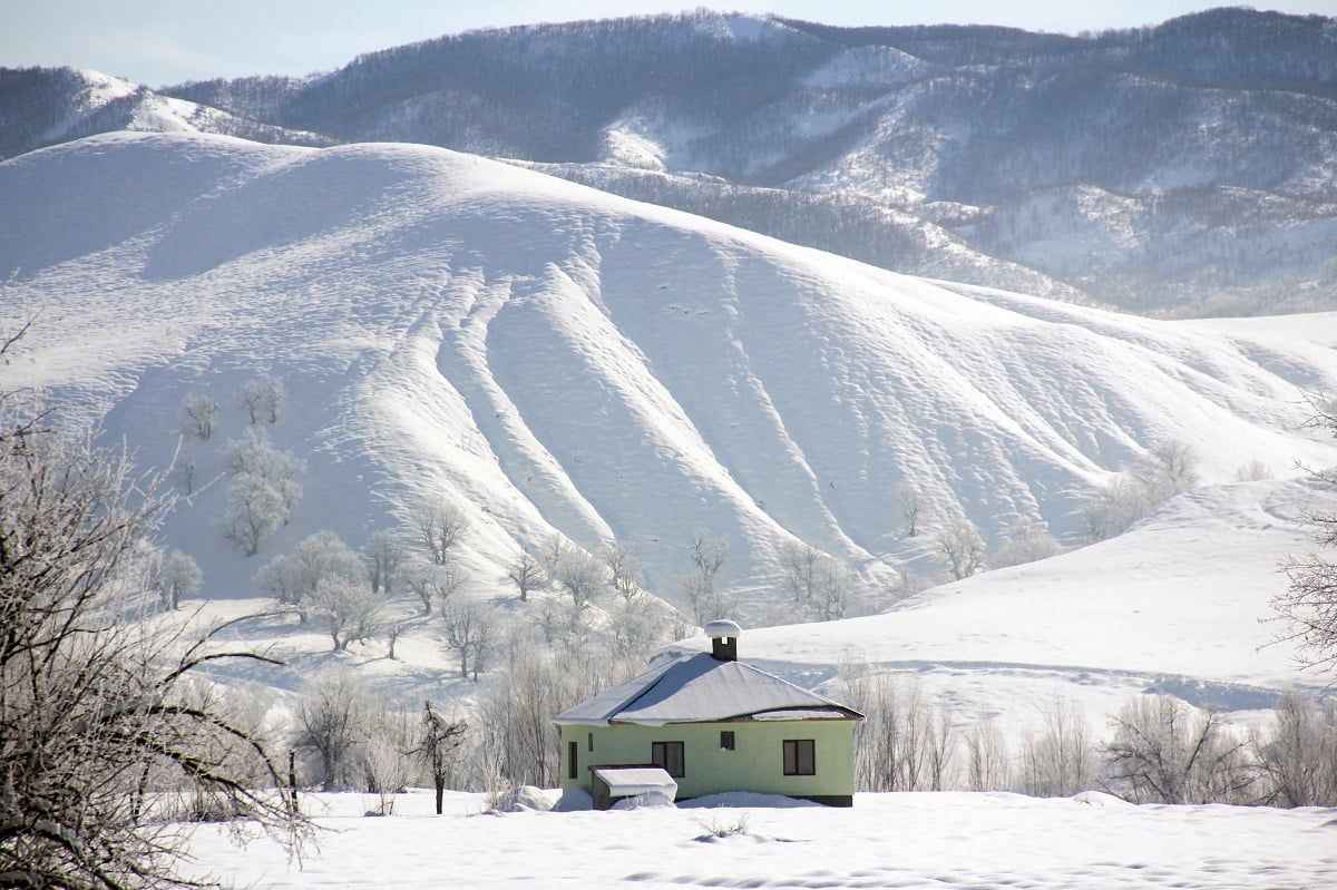 Selim ilçesine bağlı Karahamza köyünde soğuk havayla birlikte ağaçlarda oluşan kırağı güzel görüntüler oluşturdu. Beyaz örtüyle kaplanan ilçede yaban hayvanları yiyecek bulmakta zorlandı.