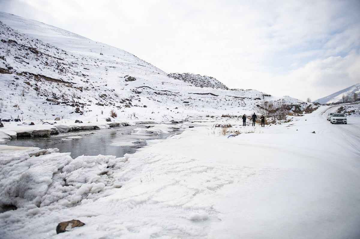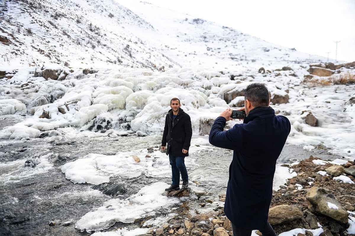 Yaklaşık 2 bin rakımda bulunan donmuş dereleri gören vatandaşlar, dere kenarına inip fotoğraf çektirdi.