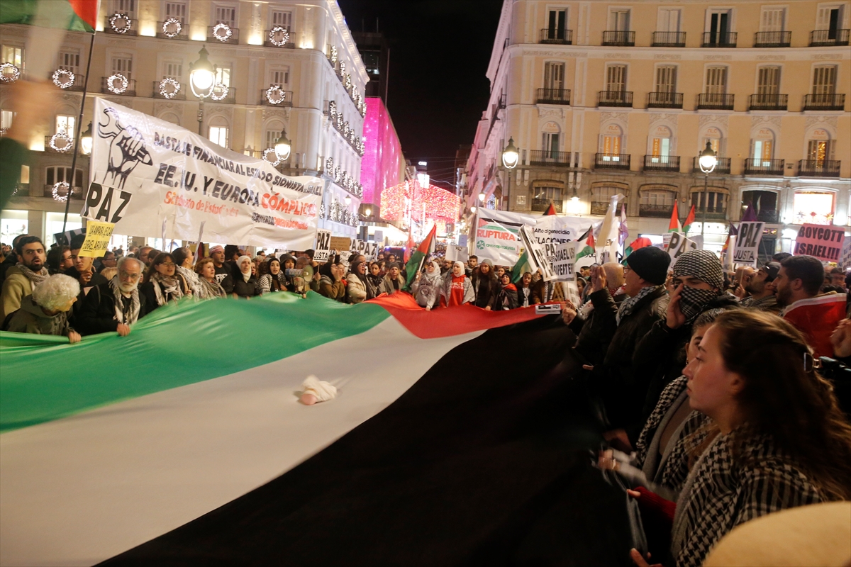 İspanya'nın başkenti Madrid'de Sol Meydanı'nda toplanan binlerce kişi, Filistin bayrakları taşıyarak "Katil İsrail", "Nehirden denize Filistin kazanacak", "Netanyahu hapse", "Filistin'e özgürlük" sloganları attı.