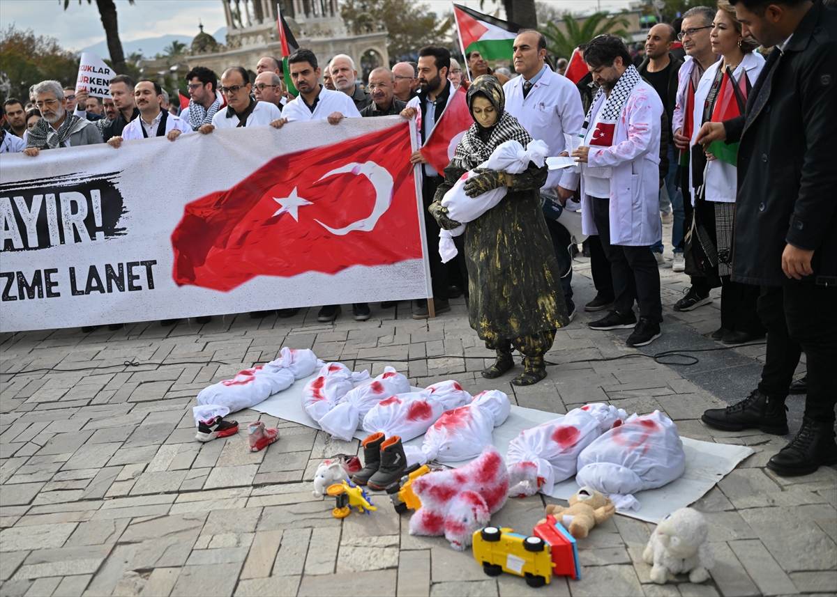 İzmir'de çeşitli hastanelerde görev yapan doktor ve sağlık çalışanları, İsrail'in Gazze'ye yönelik saldırılarını protesto için sessiz yürüyüş düzenledi.