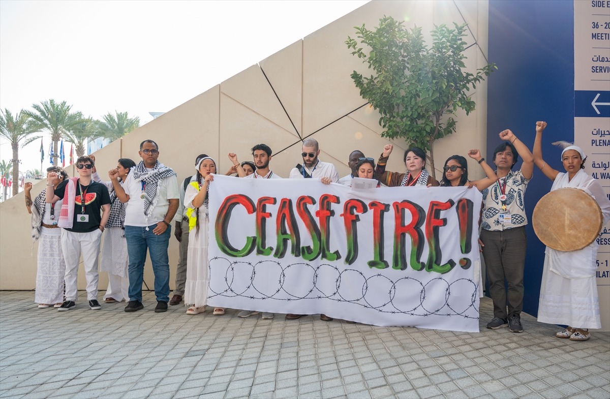 COP28 Zirvesinin yapıldığı alanda toplanan bir grup, Filistin'le dayanışma gösterisi düzenledi. Göstericiler "ateşkes" yazılı pankart taşıdı.