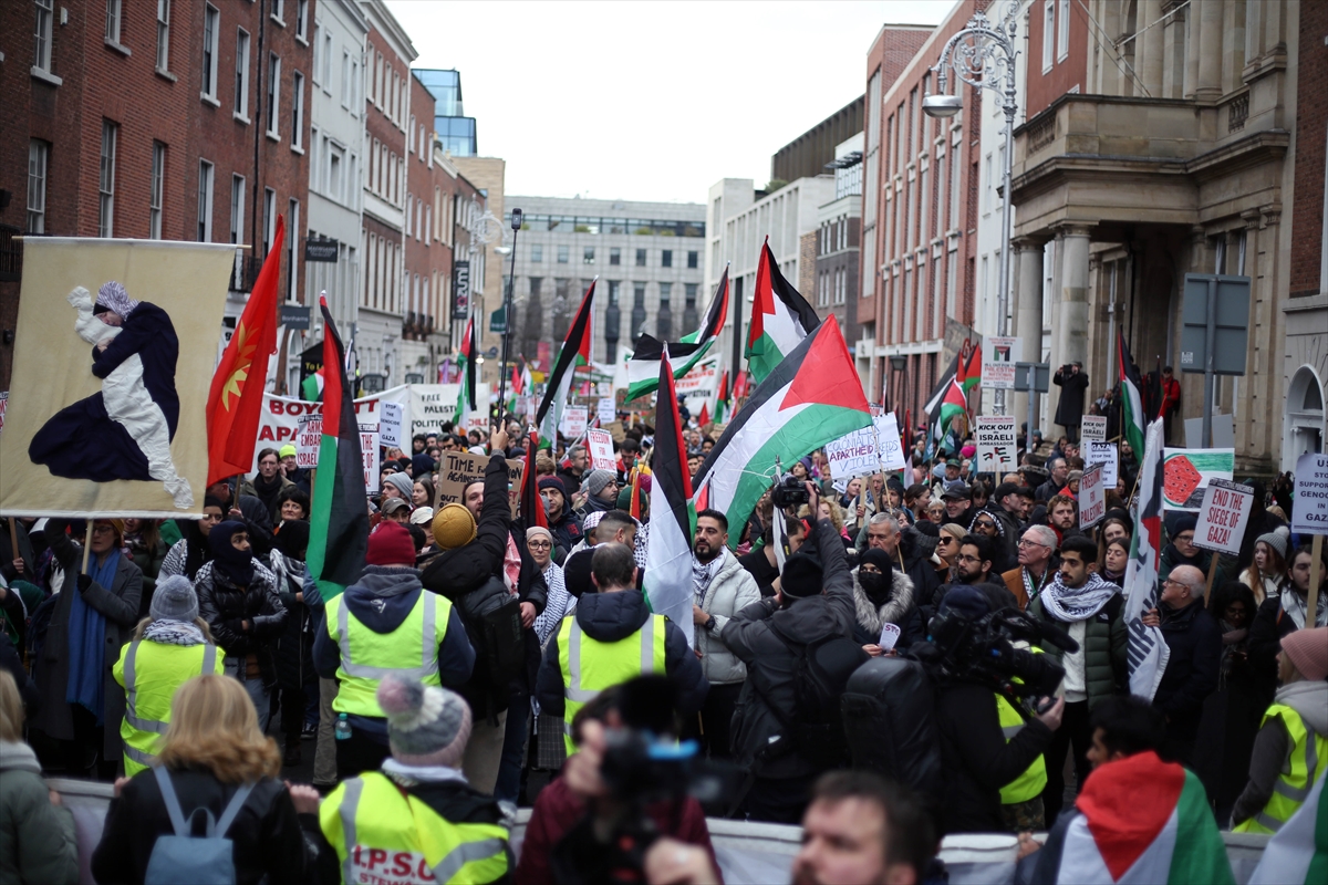 İrlanda'nın başkenti Dublin'de bir arayan gelen göstericiler, İsrail'in Gazze'ye yönelik saldırılarını protesto ederek Filistin halkına destek gösterisi düzenledi. Kent merkezinde yürüyüş düzenleyen göstericiler ateşkes çağrısında bulundu.