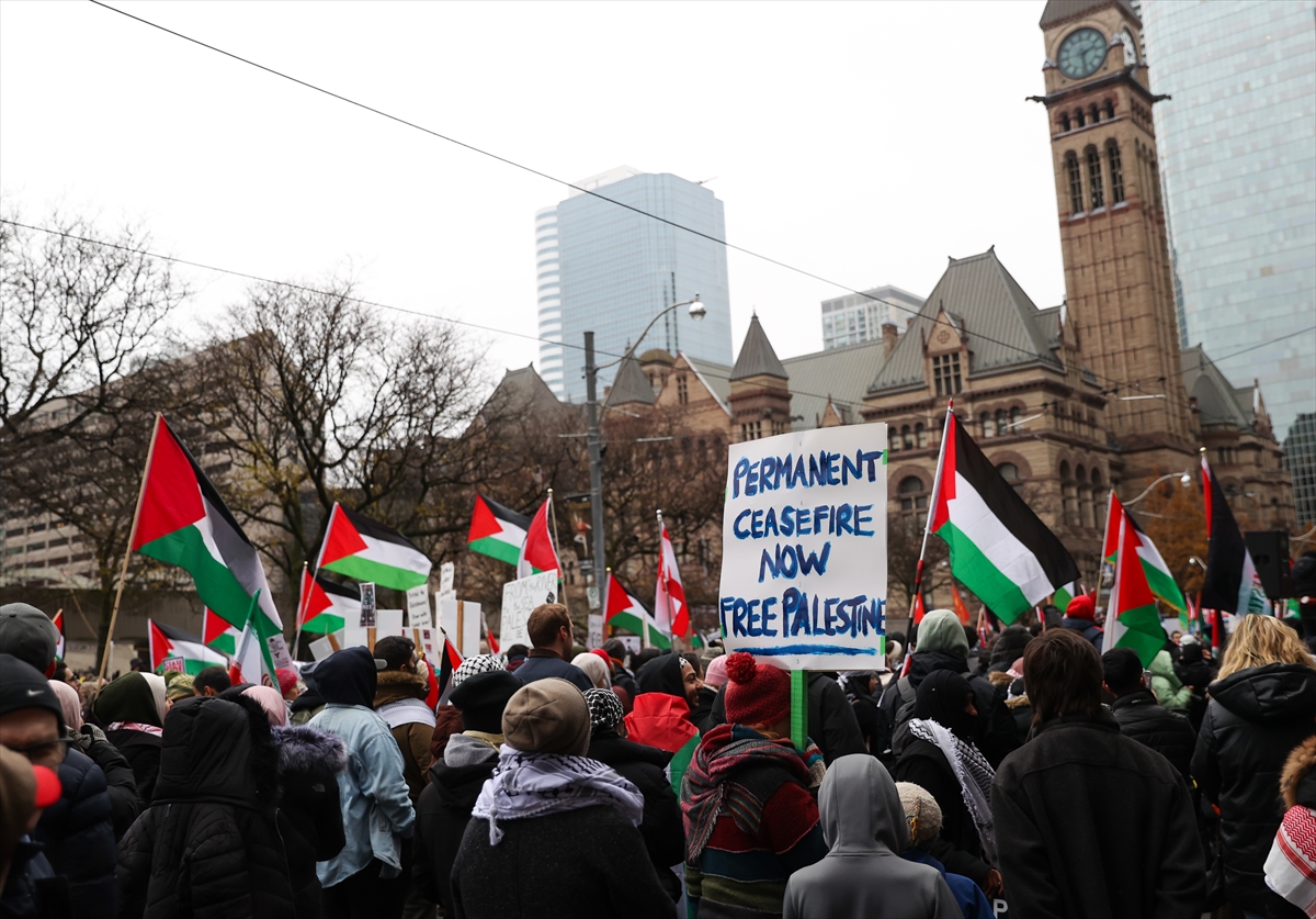 İsrail'in Gazze'ye yönelik saldırılarını protesto eden göstericiler, ellerinde pankart ve Filistin bayrakları taşıyarak Nathan Phillips Meydanı'ndan başlayarak, Kanada'nın Toronto şehir merkezinde yürüdü.
