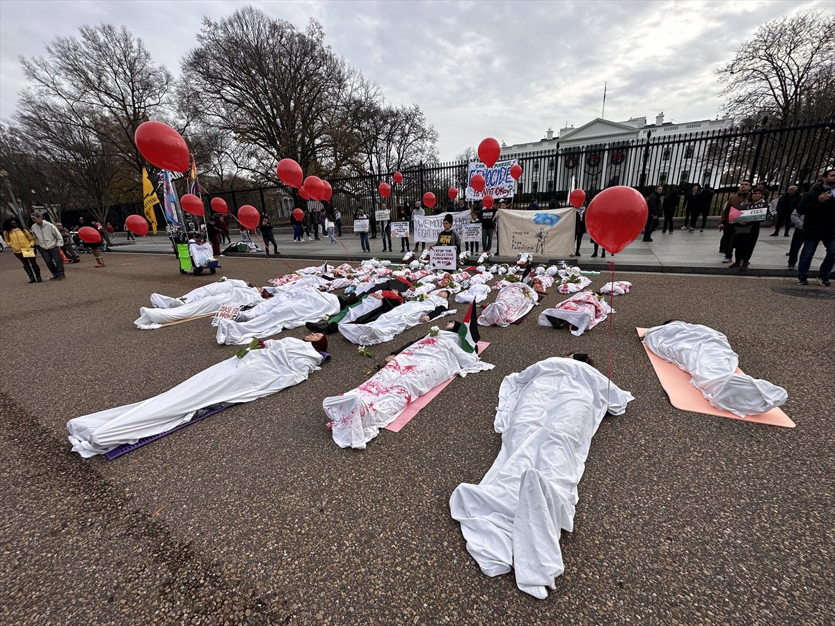 ABD'nin başkenti Washington'da, Beyaz Saray’ın önünde bir araya gelen aktivistler, Filistin'le dayanışmalarını ifade etmek için "Ölüm" temalı protesto gösterisi düzenledi.