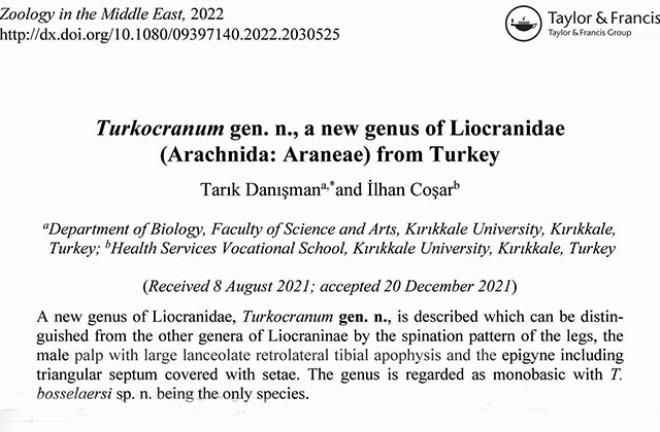 Kırıkkale Üniversitesi Biyoloji Bölümü Zooloji Ana Bilim Dalı Öğretim Üyesi Doç. Dr. Tarık Danışman ile Sağlık Hizmetleri Meslek Yüksekokulu Tıbbi Hizmetler ve Teknikler Bölümü Öğretim Görevlisi Dr. İlhan Coşar, dünyada sadece Kahramanmaraş'ın Göksun ilçesinde yaşayan yeni örümcek cinsi keşfetti. Danışman, 'Turkocranum' ismini verdikleri örümceği, uluslararası indeksli 'Zoology in the Middle East' dergisinde yayımlatarak, dünya örümcek literatürüne kazandırdıklarını söyledi.