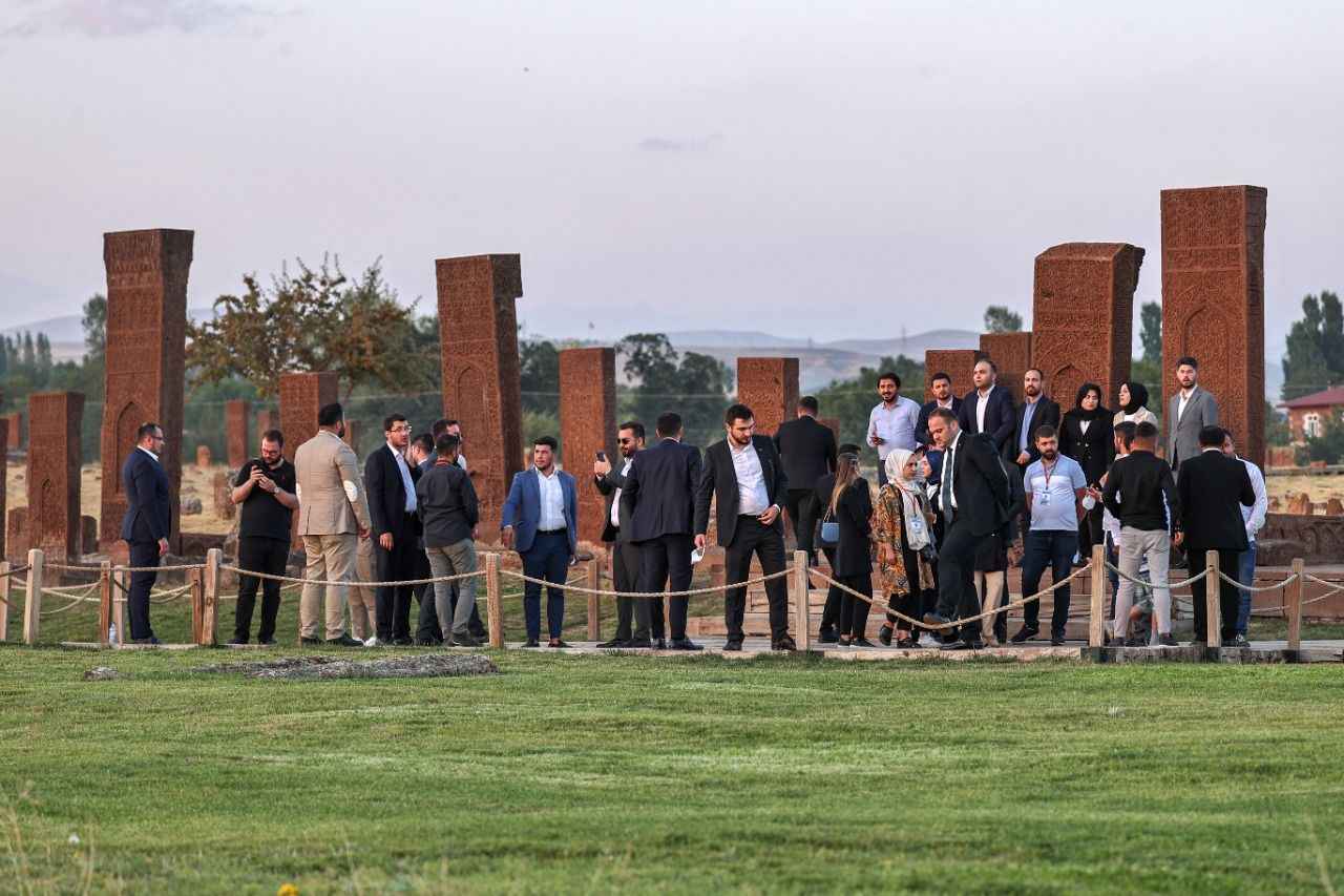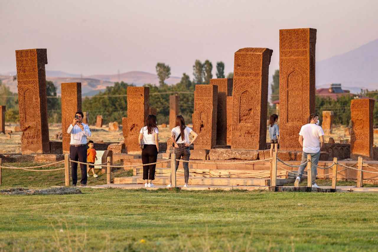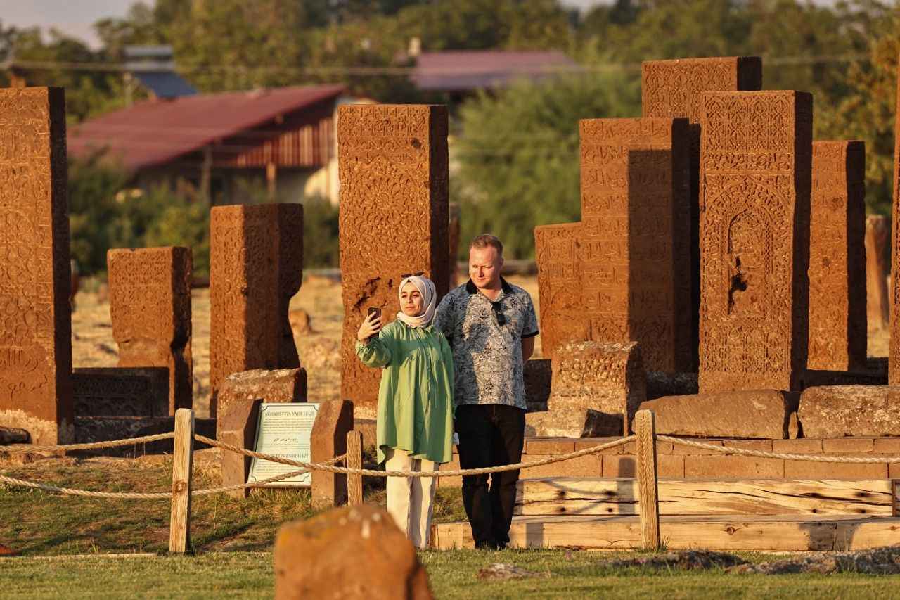 Aralarında birçok ülkenin diplomat ve temsilcilerinin de bulunduğu ziyaretçiler, üzerlerindeki yazılar, kabartmalar, oymalarıyla birbirinden değerli 8 bin 122 mezar taşının bulunduğu mezarlıkta fotoğraf çektirdi.