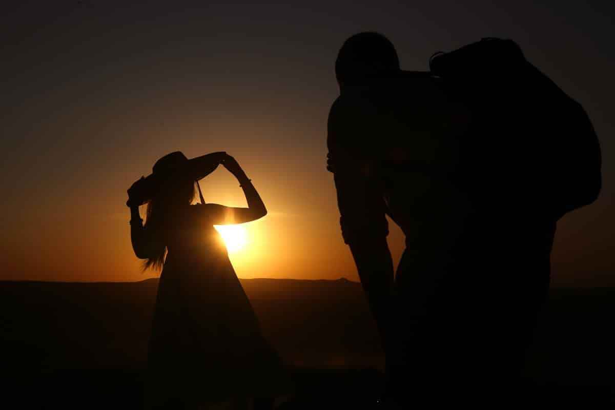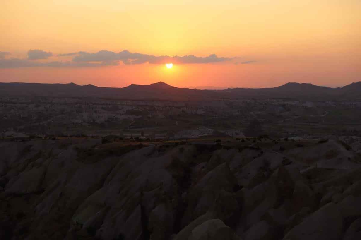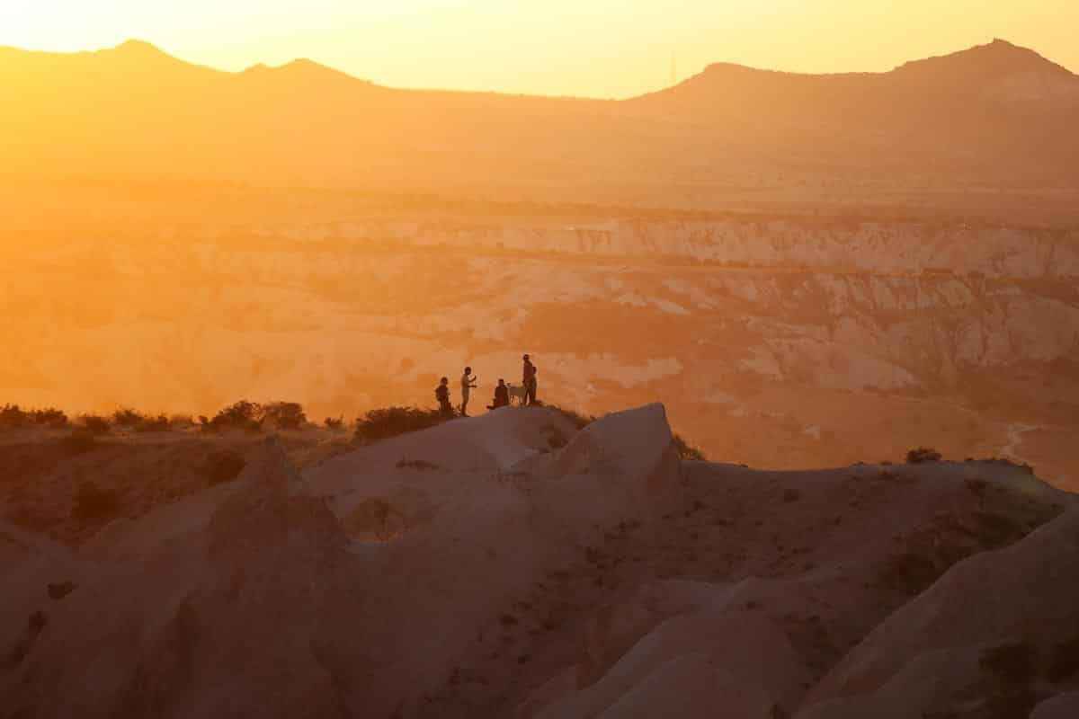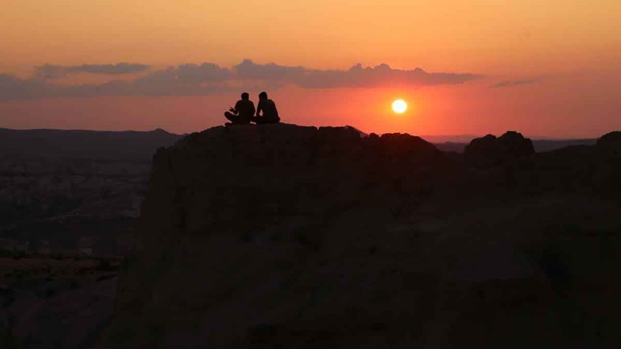 Peribacaları ve doğal kaya oluşumlarıyla kaplı vadiler arasında gün boyu çeşitli aktivitelere katılan turistler, gün batımına doğru Ürgüp ilçesine bağlı Ortahisar beldesindeki Kızılçukur'da, güneşin peribacaları ve kaya oluşumlarına yansıyan son renklerini izleyerek günü tamamlıyor.
