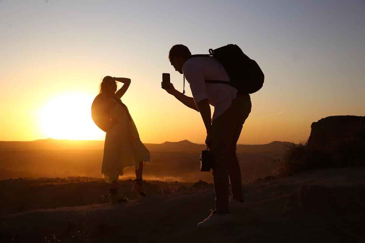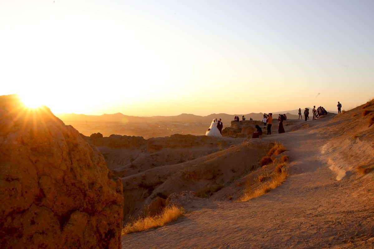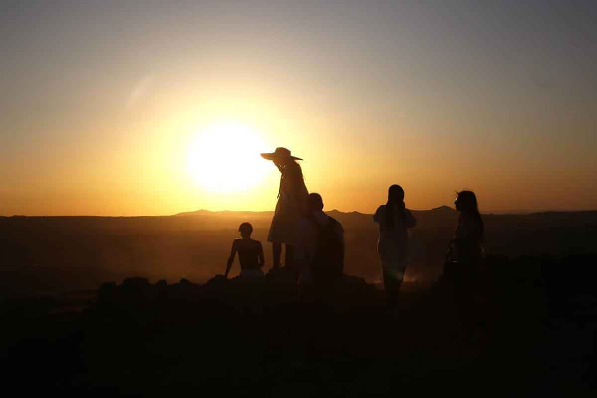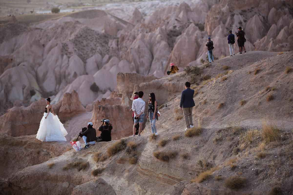 UNESCO Dünya Kültür Mirası Listesi'ndeki bölgede, gün batımını izlemek için vadi girişine gelen konuklar, seyir alanında farklı ışık huzmeleri altında hatıra fotoğrafı çekiyor.